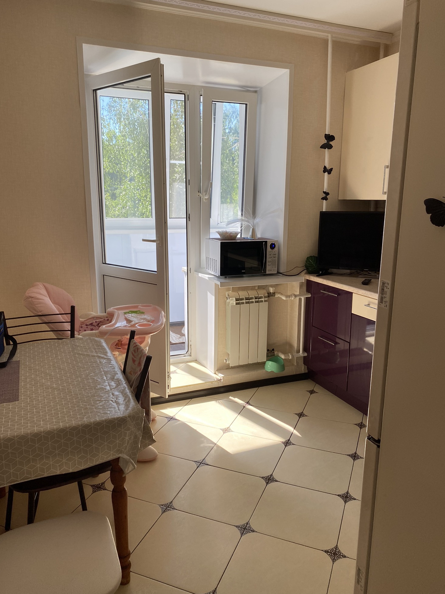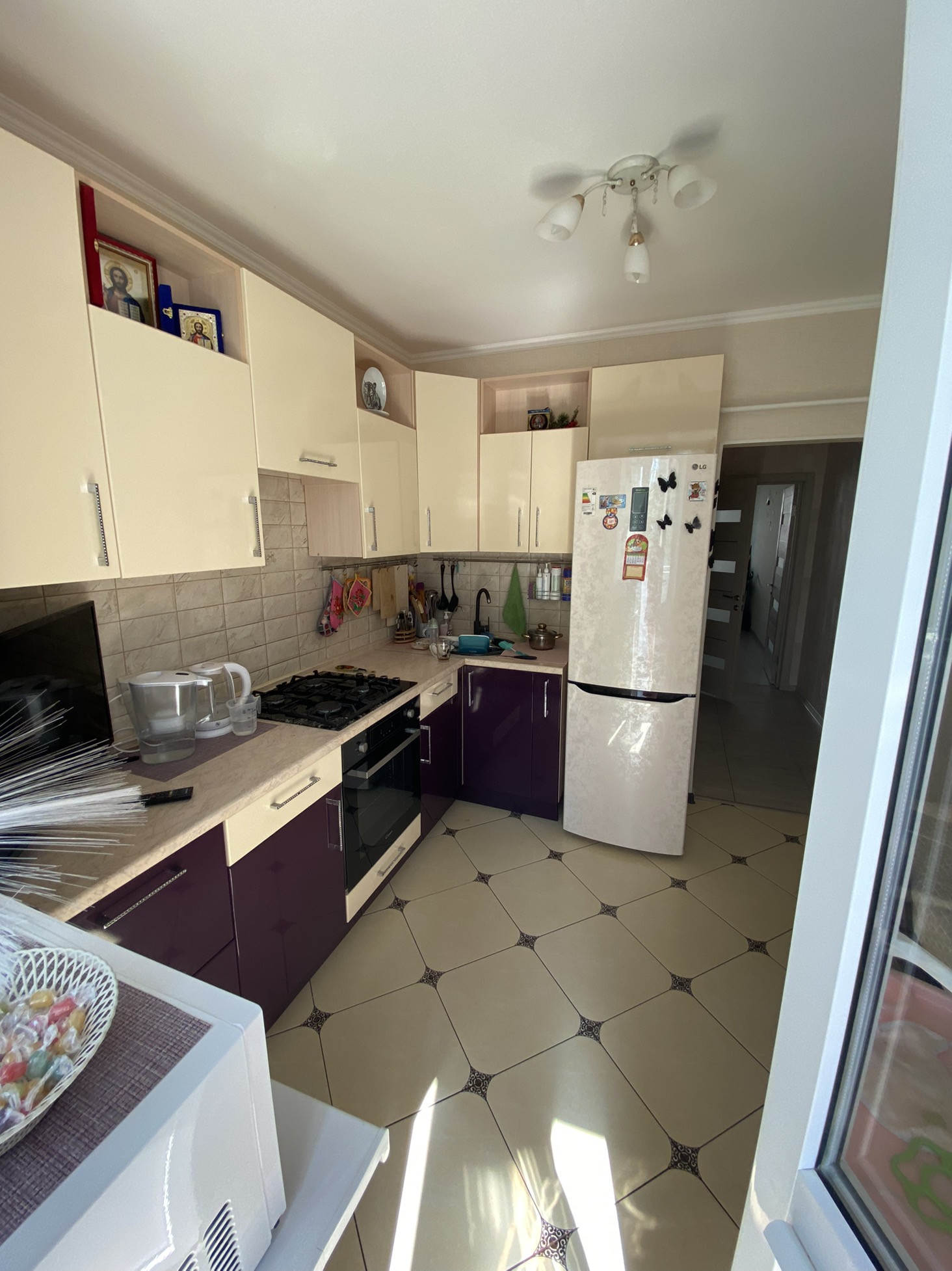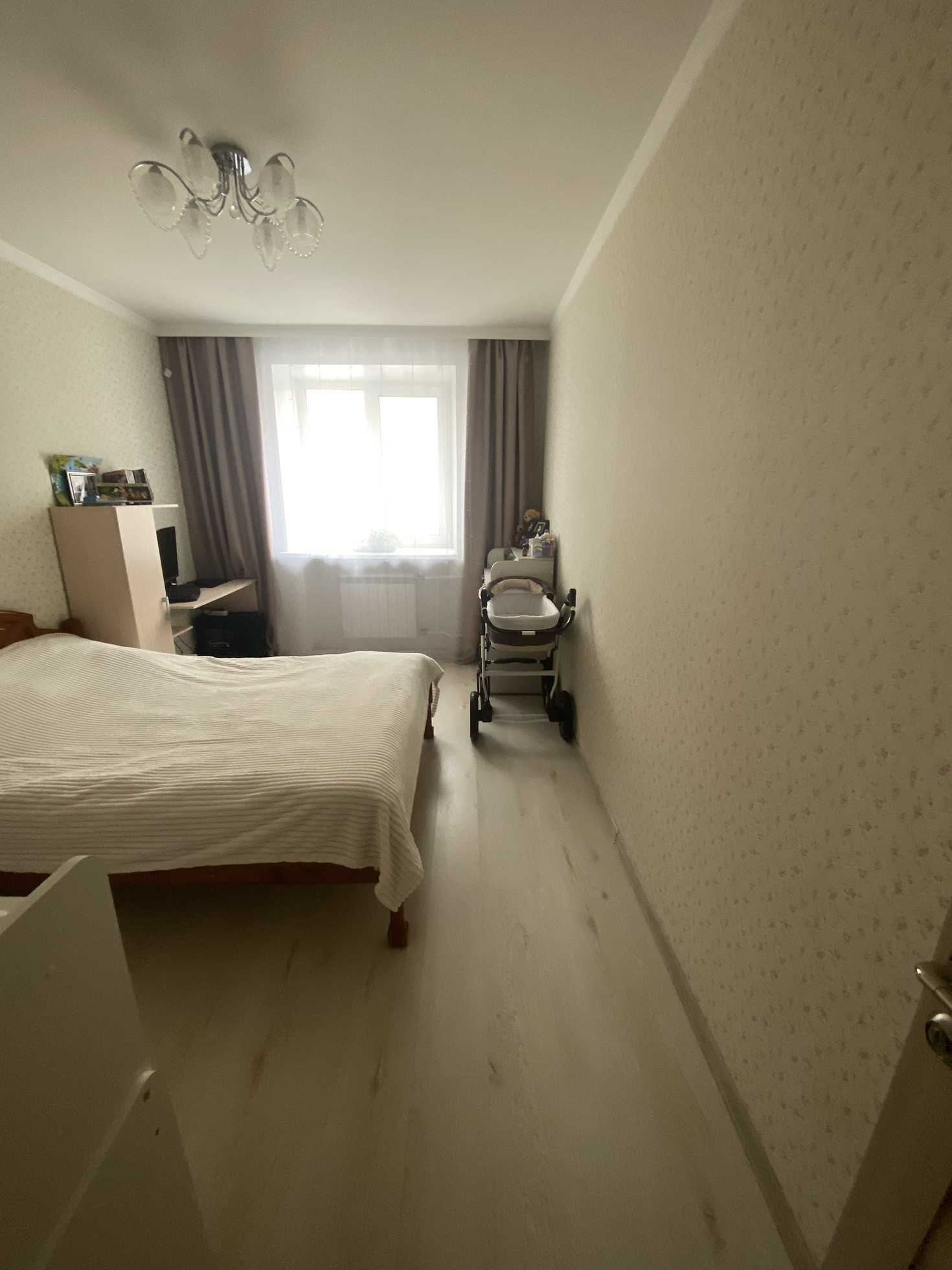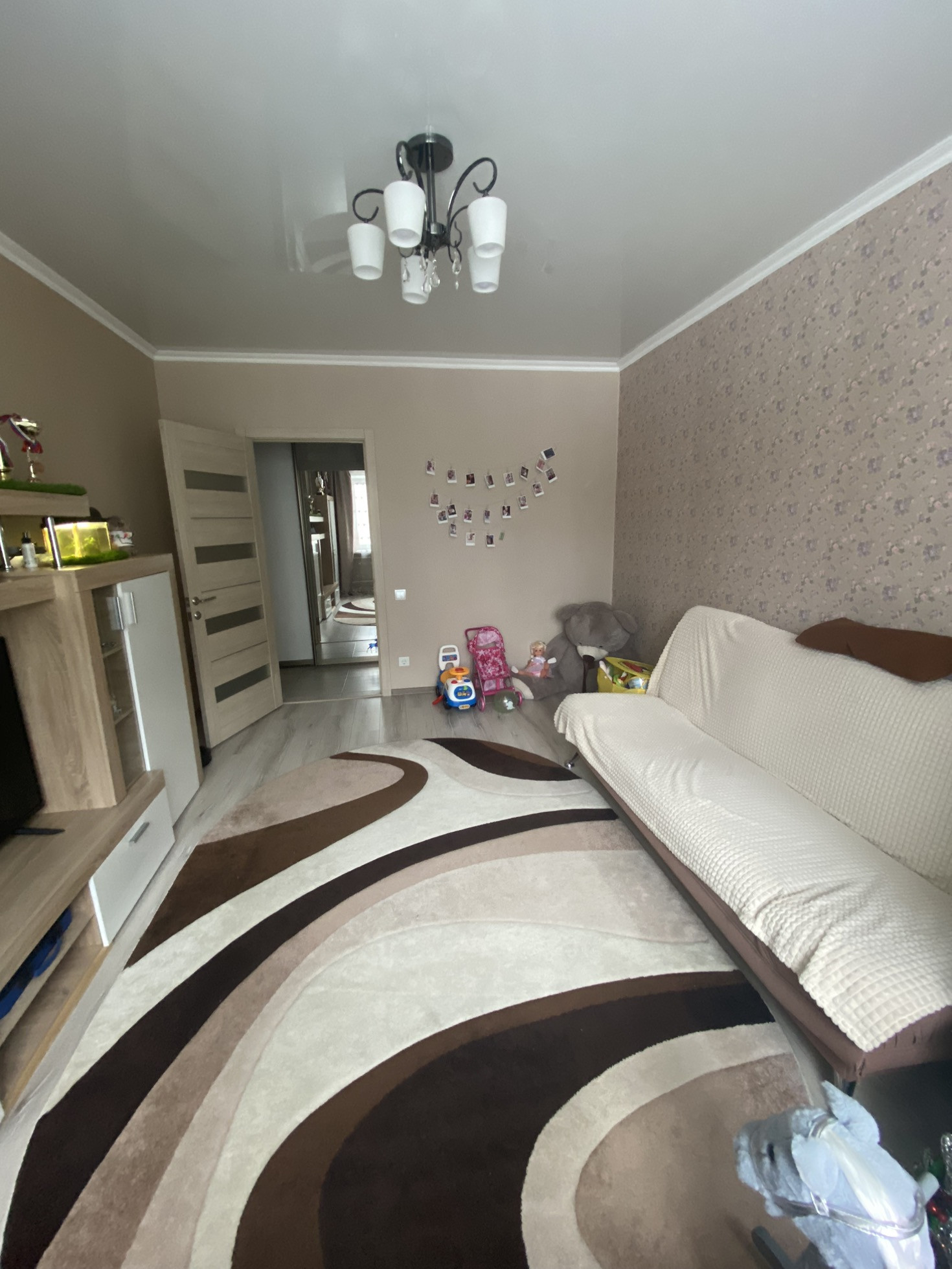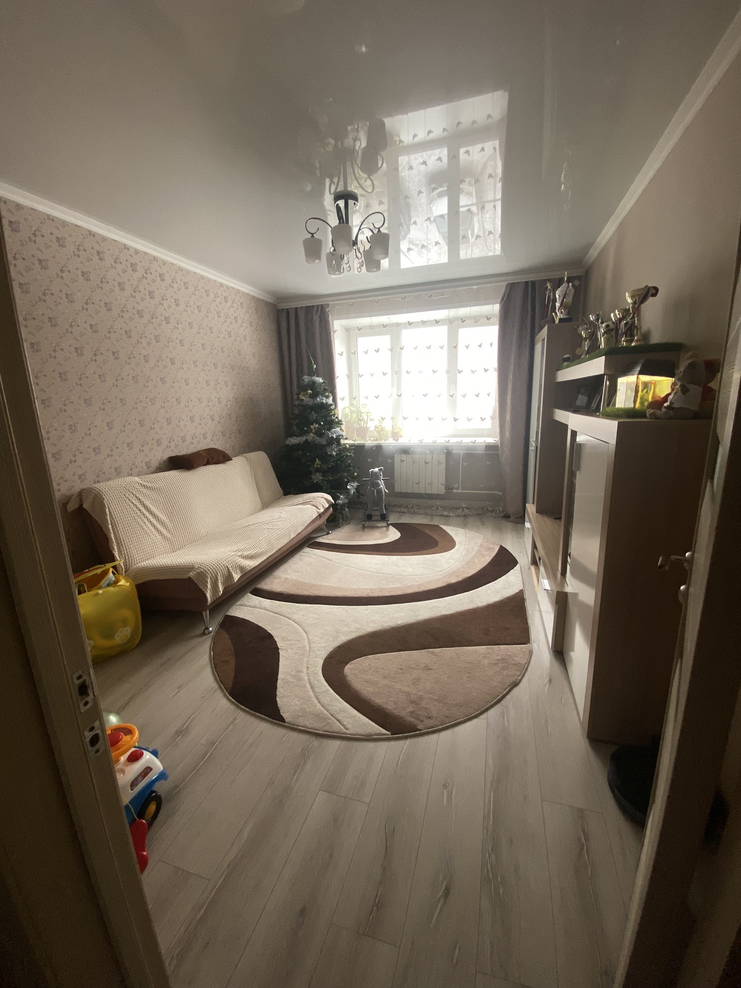 Квартира в спальном районе, не угловая, окна на две стороны, комнаты изолированные, санузел и ванна в плитке, в коридоре, на кухне на полу плитка, в комнатах ламинат, на балконе линолеум, натяжные потолки кроме кухни, ванны, остаётся мебель