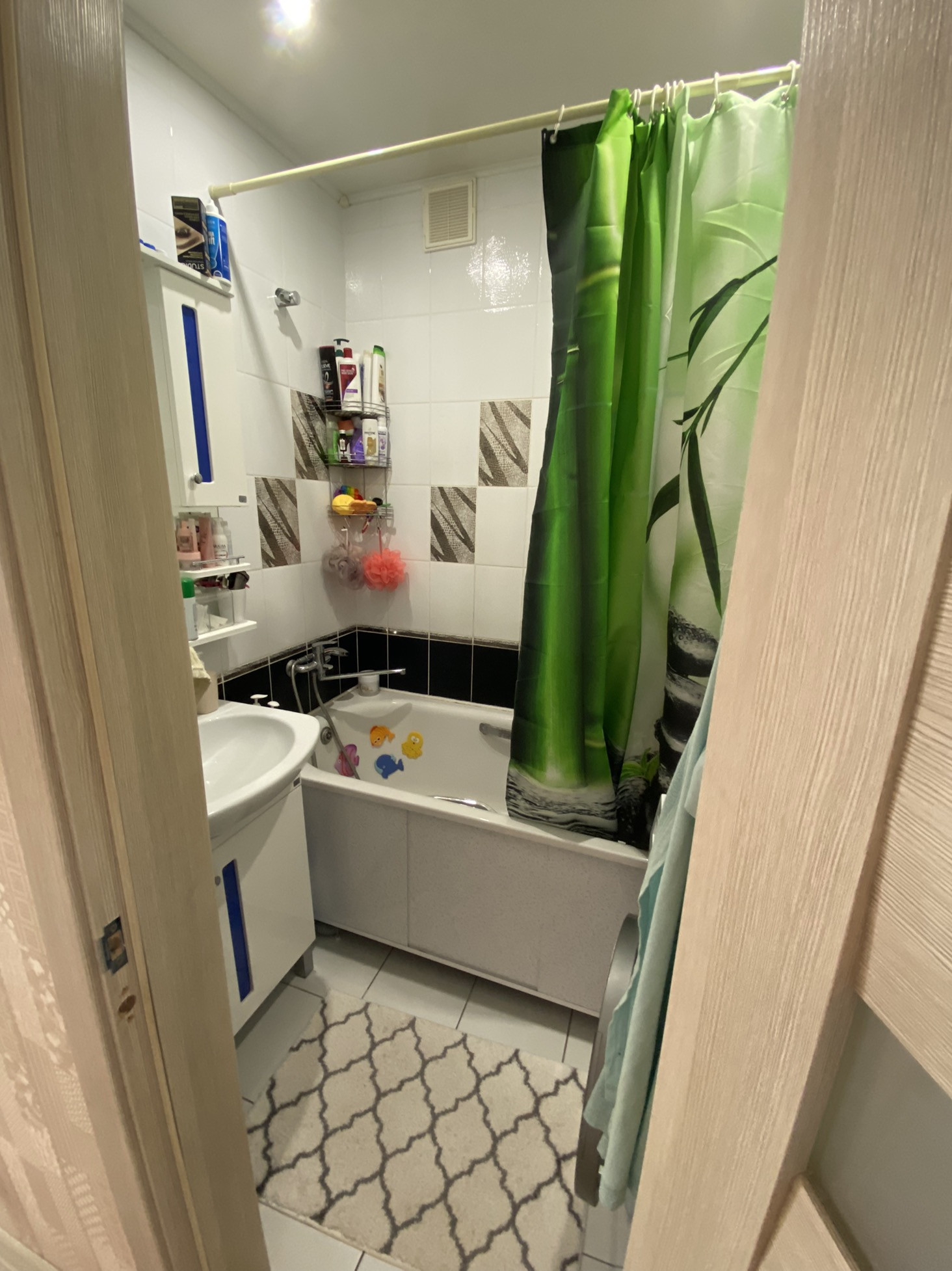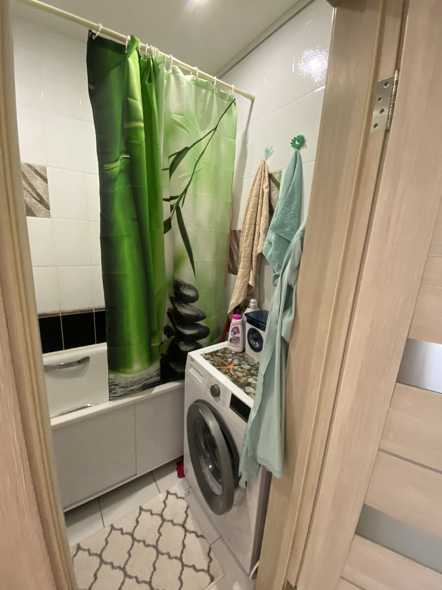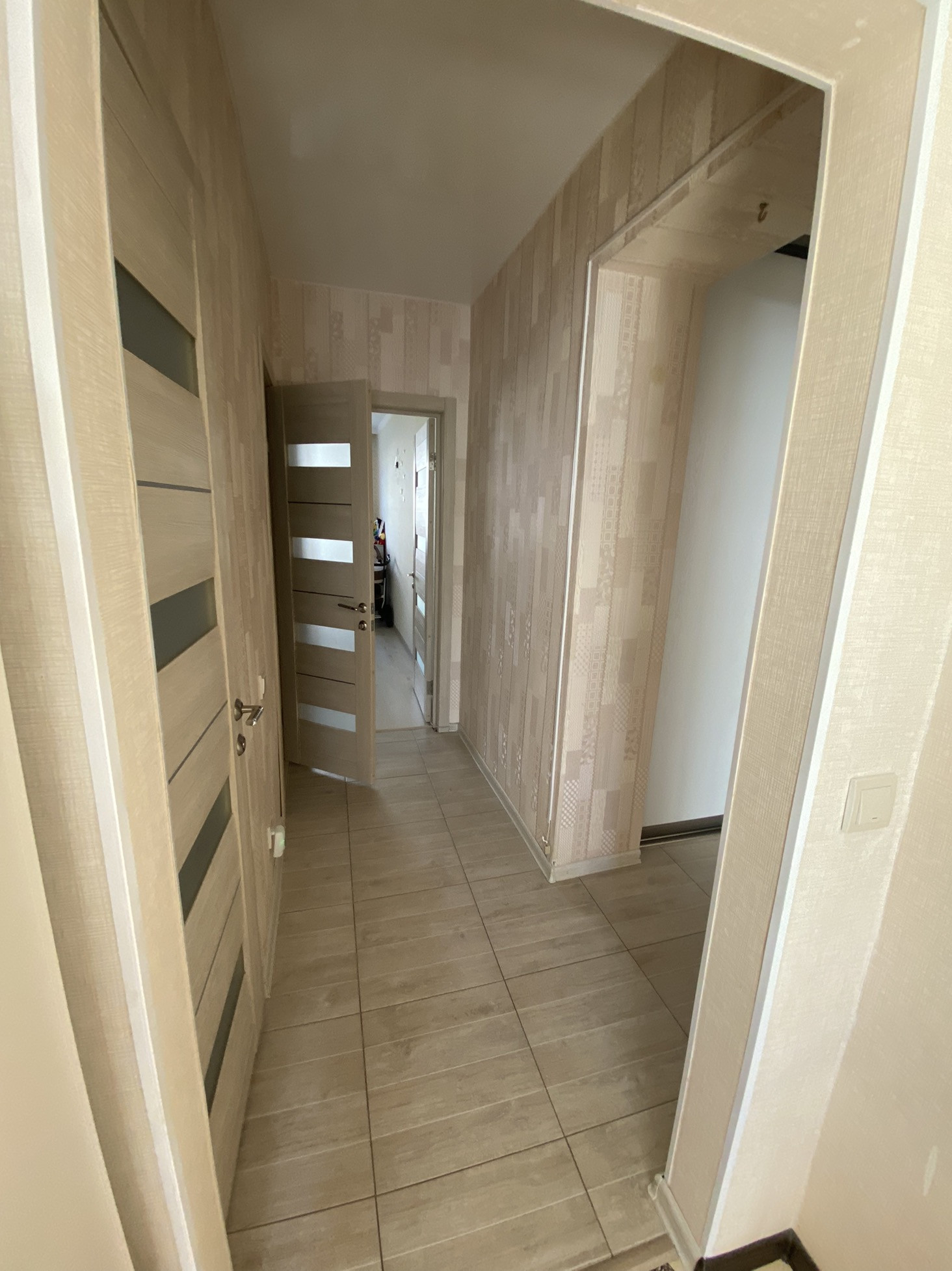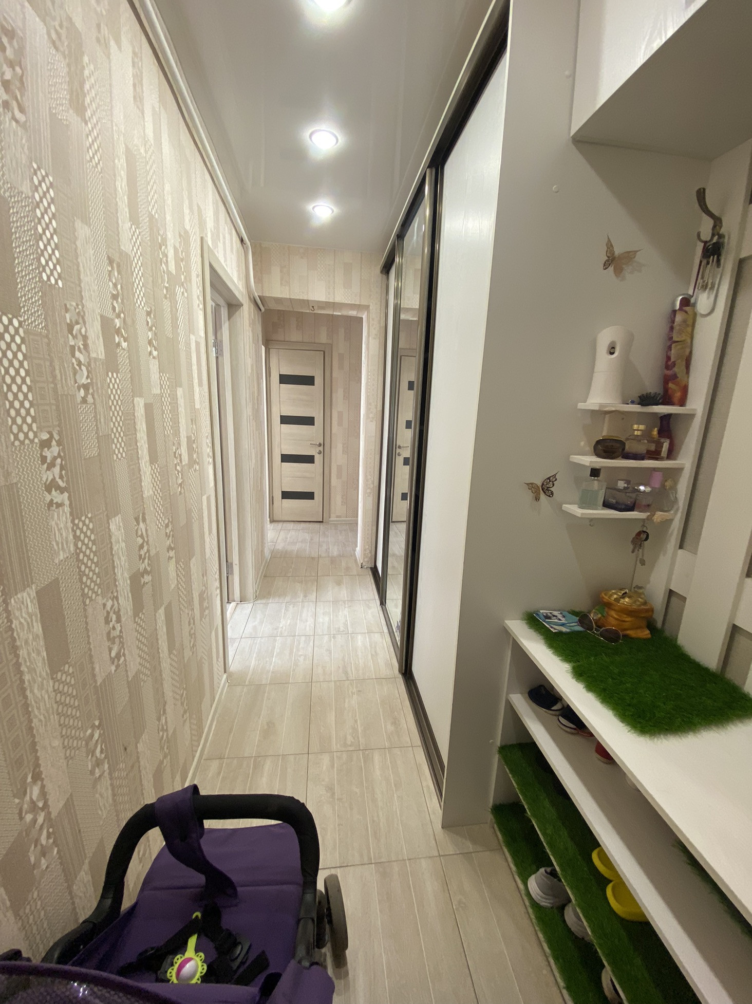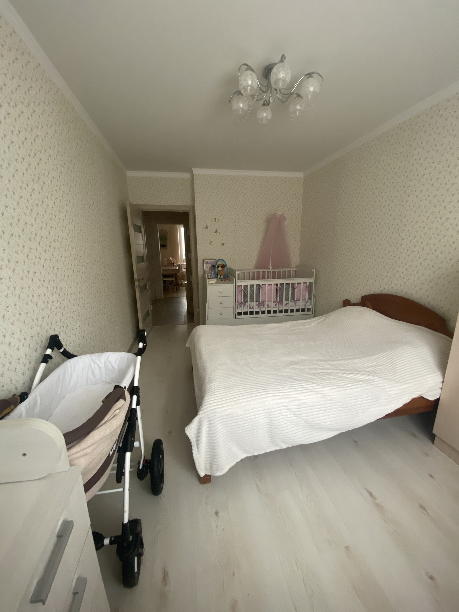 Квартира в спальном районе, не угловая, окна на две стороны, комнаты изолированные, санузел и ванна в плитке, в коридоре, на кухне на полу плитка, в комнатах ламинат, на балконе линолеум, натяжные потолки кроме кухни, ванны, остаётся мебель