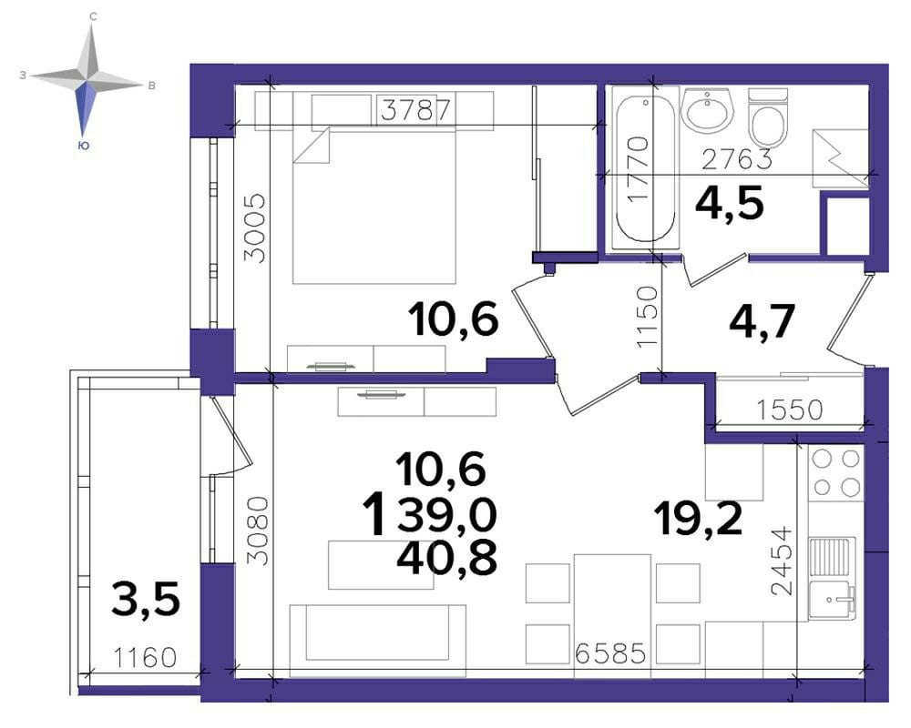 Общая площадь 40.8 м2