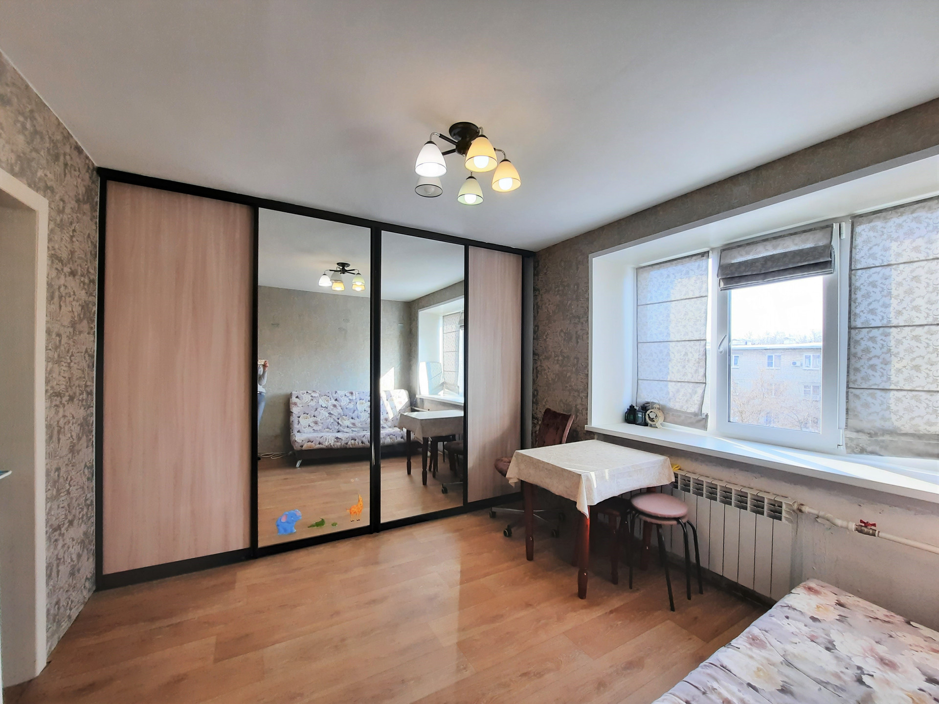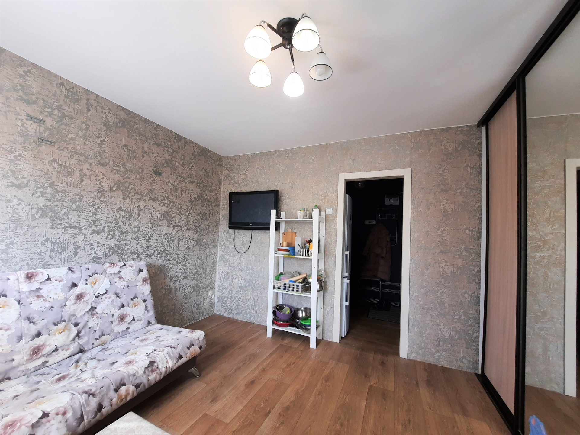 В комнате остаётся вместительный шкаф-купе и диван.