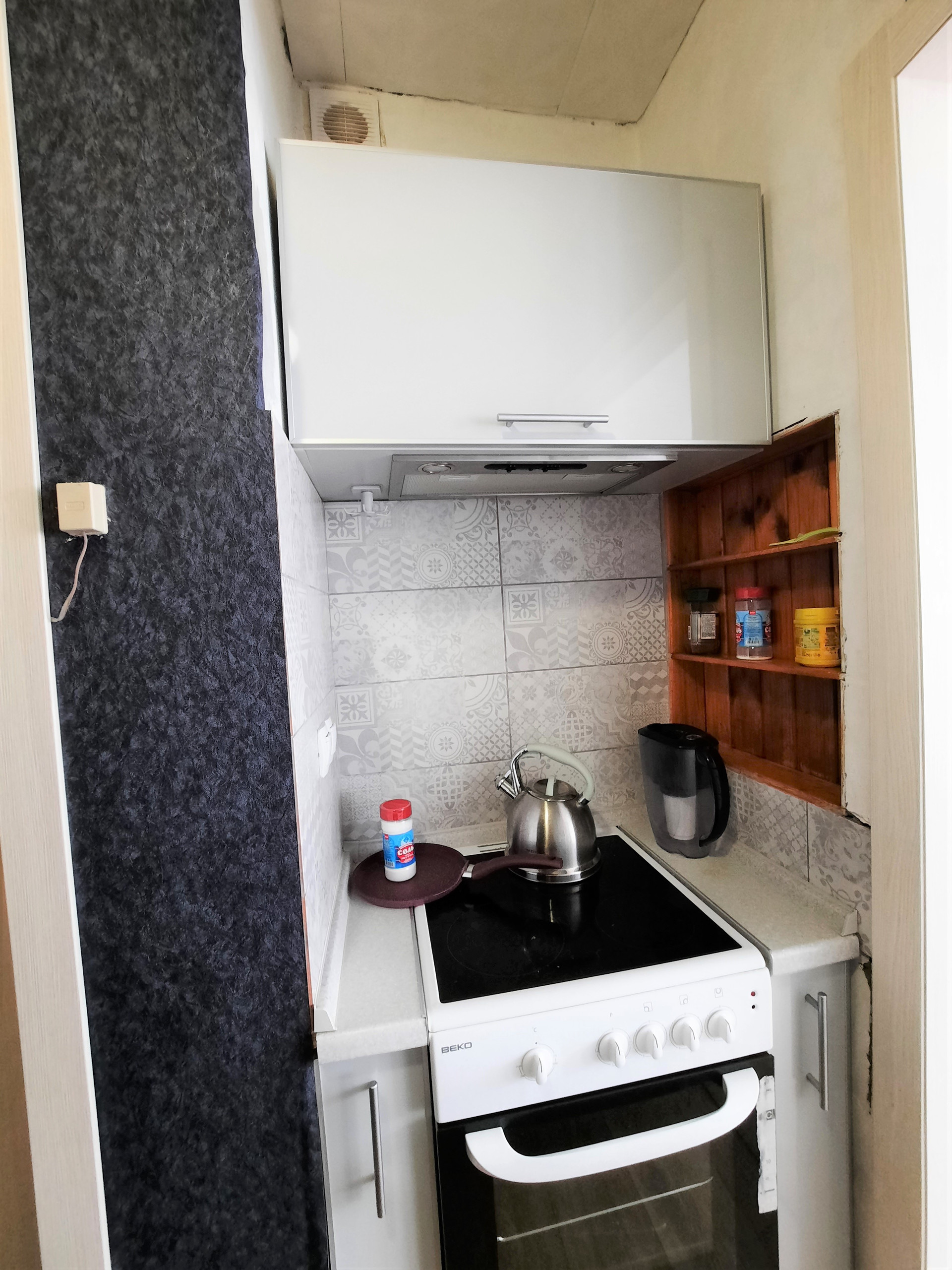 В прихожей оборудовано место для приготовление еды. Полноценная электро-плита, шкафчики для посуды.
