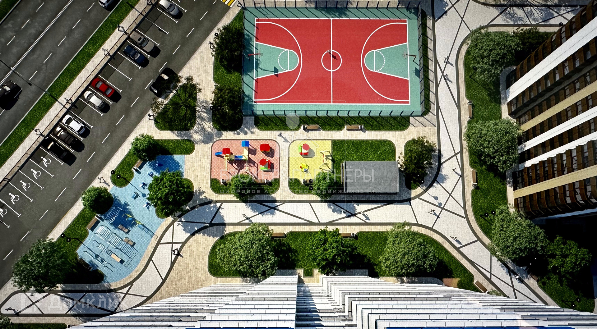 Благоустроенный двор с оборудованной детской площадкой и зоной для отдыха, свободные парковочные места.