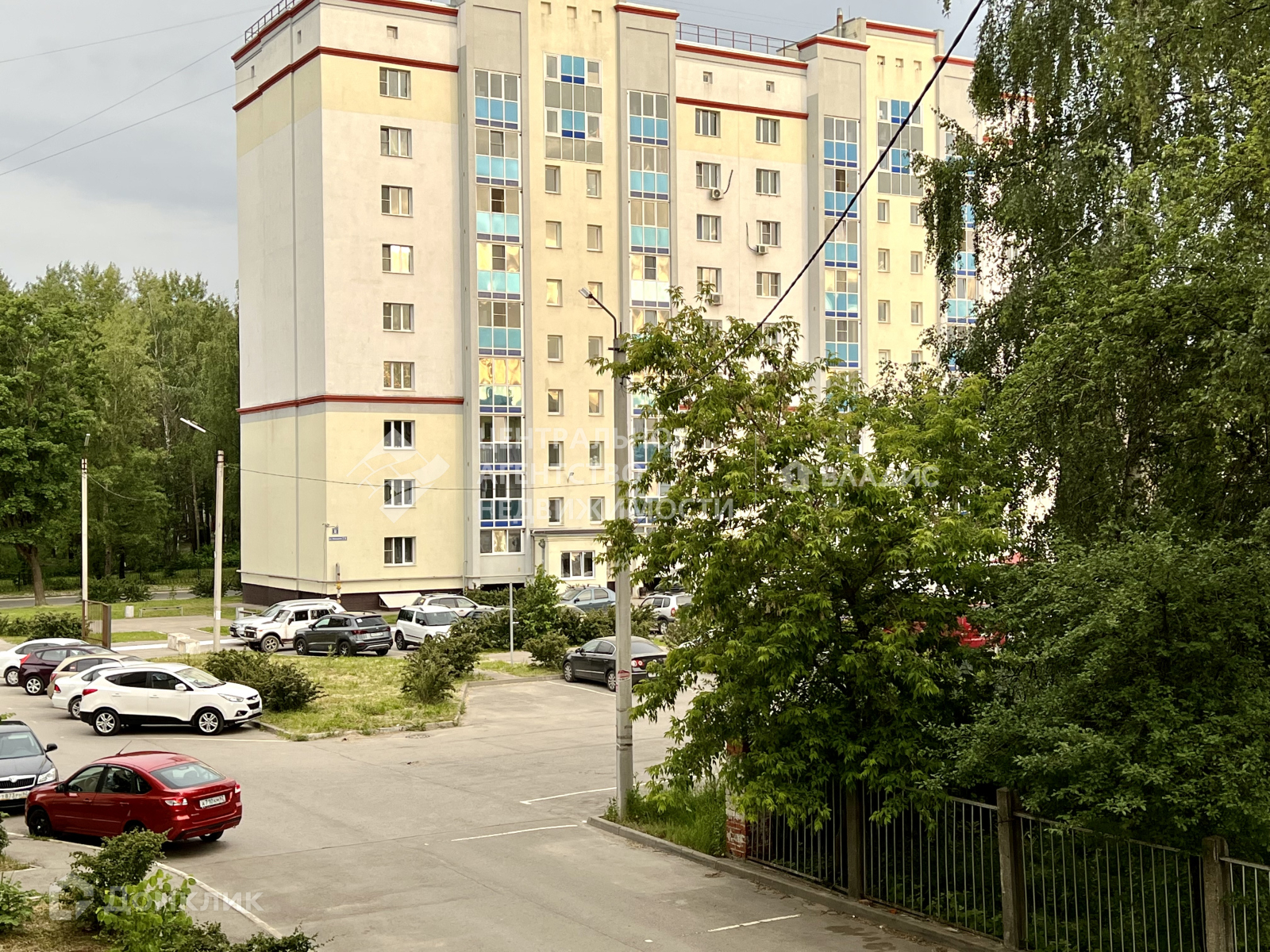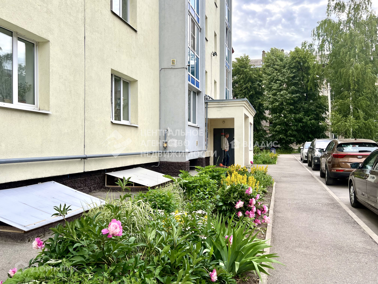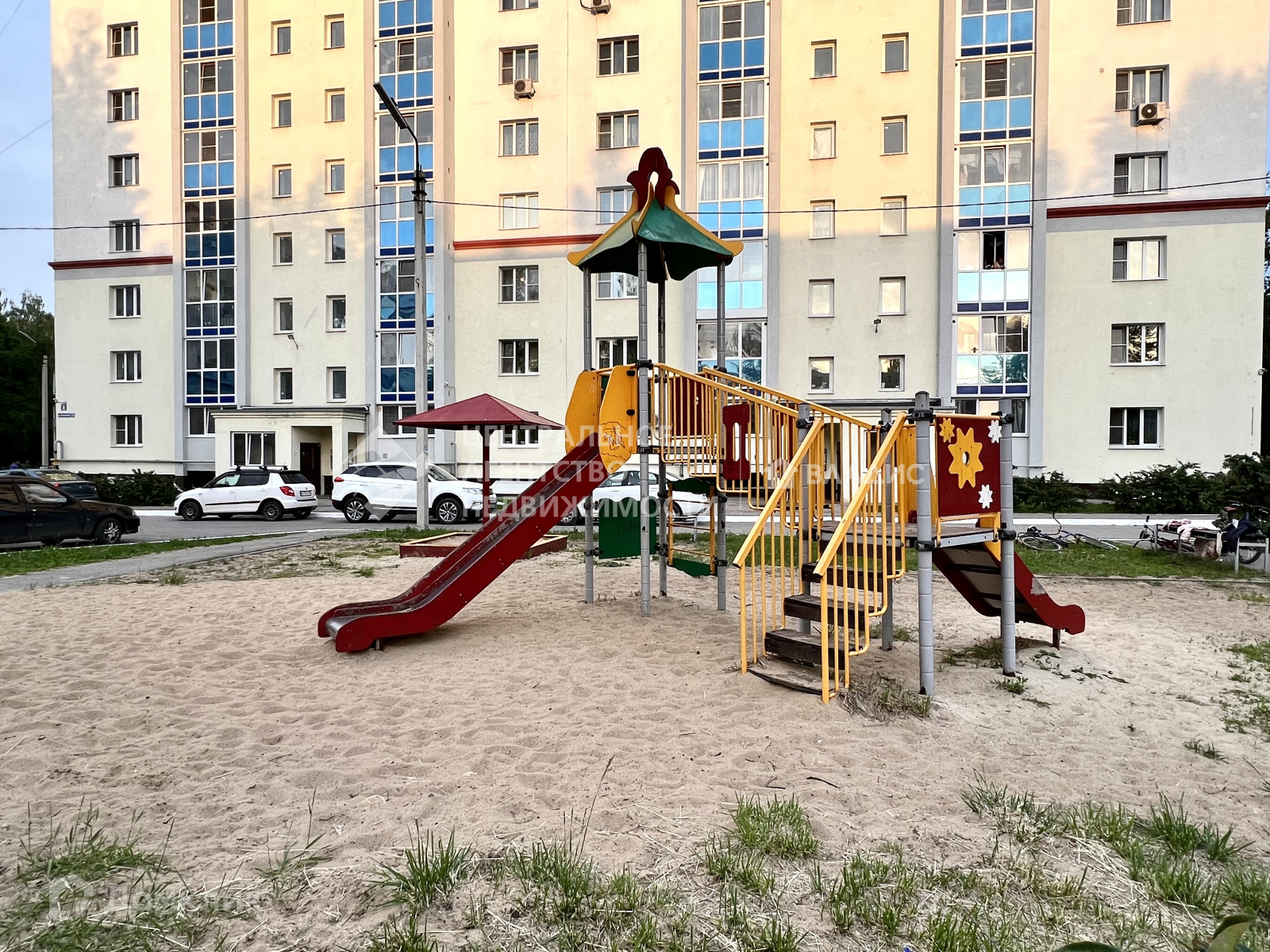 Обустроенная территория вокруг дома, детская и спортивные площадки, много парковочных мест.