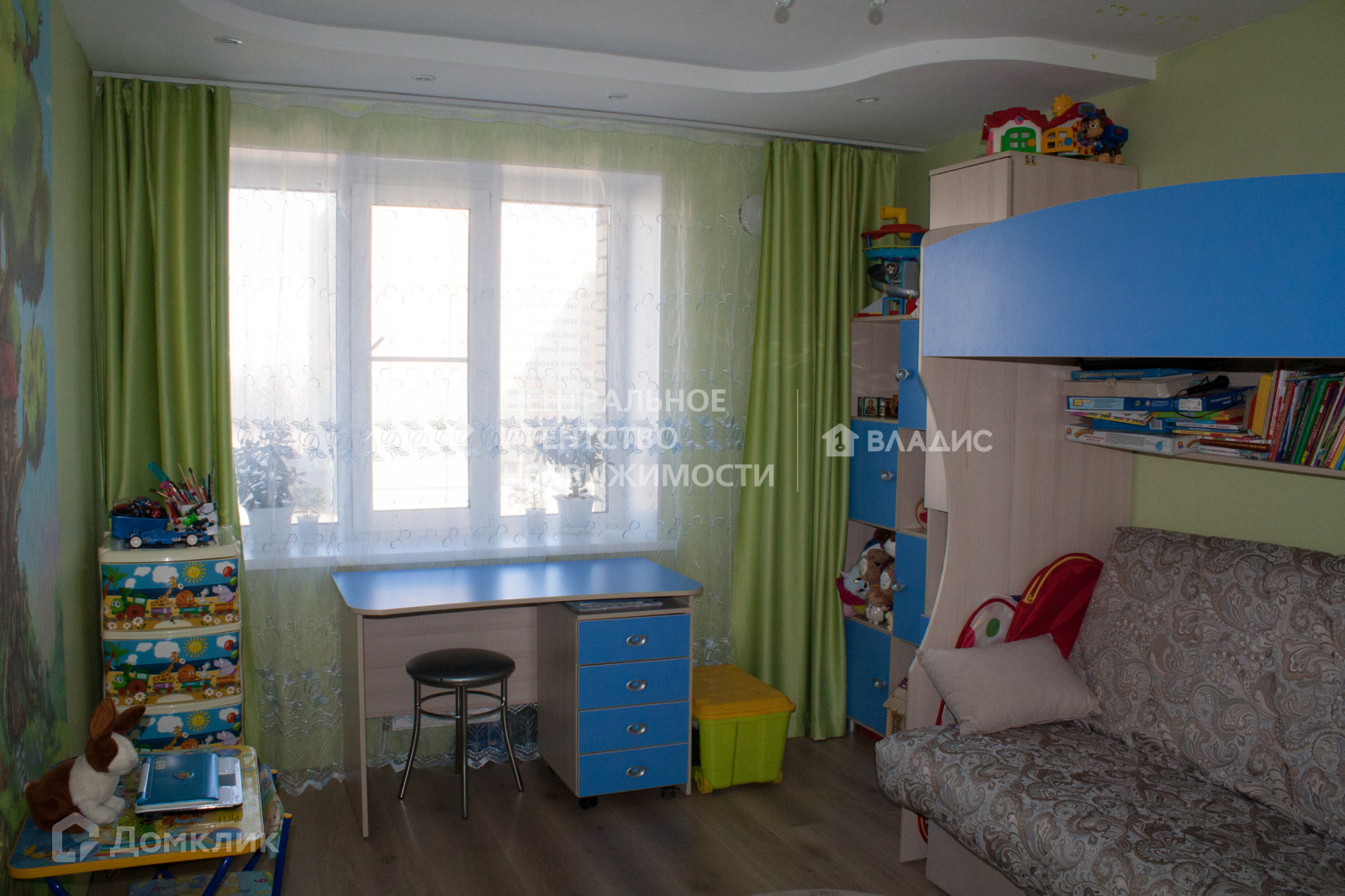 Полностью оборудованная детская комната в спокойных оттенках и цветах.