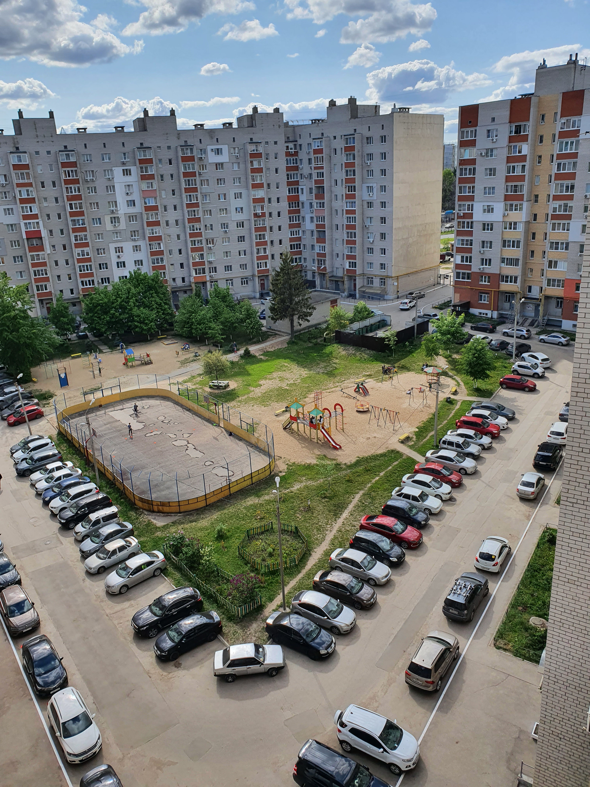 Шлагбаум на въезде во двор, во дворе детская площадка с хоккейной коробкой, видеонаблюдение по всей территории двора.
