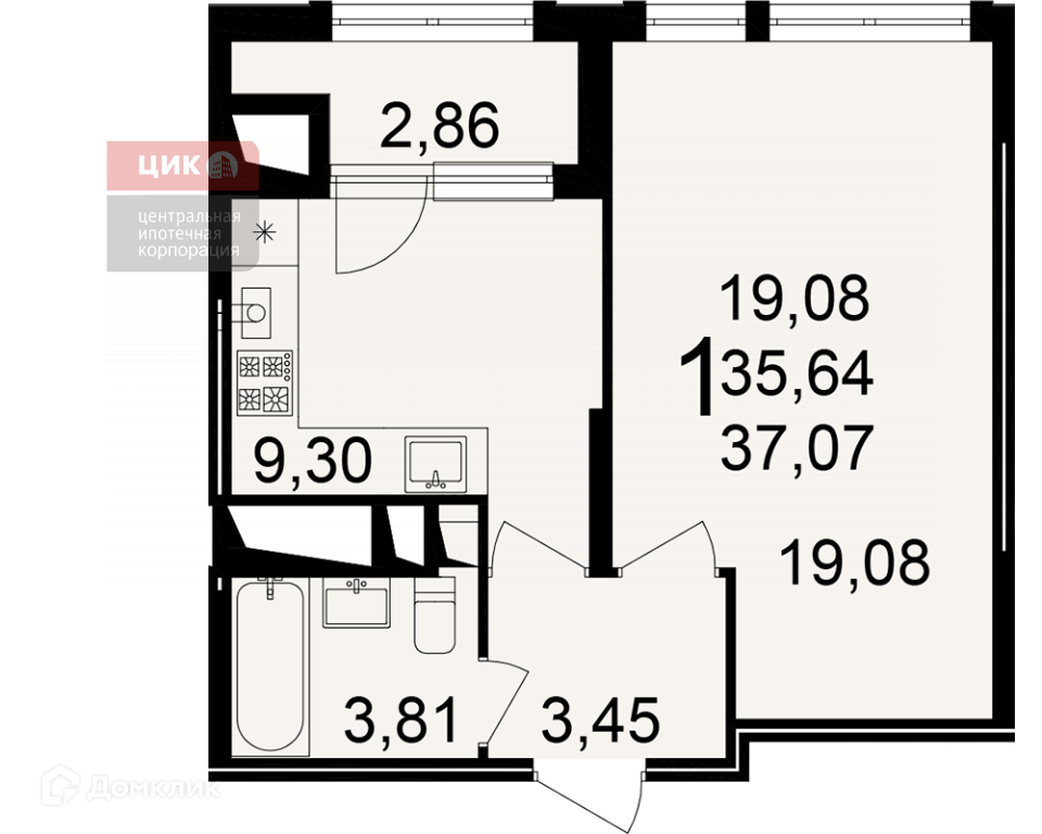 Общая площадь 37.07 м2
