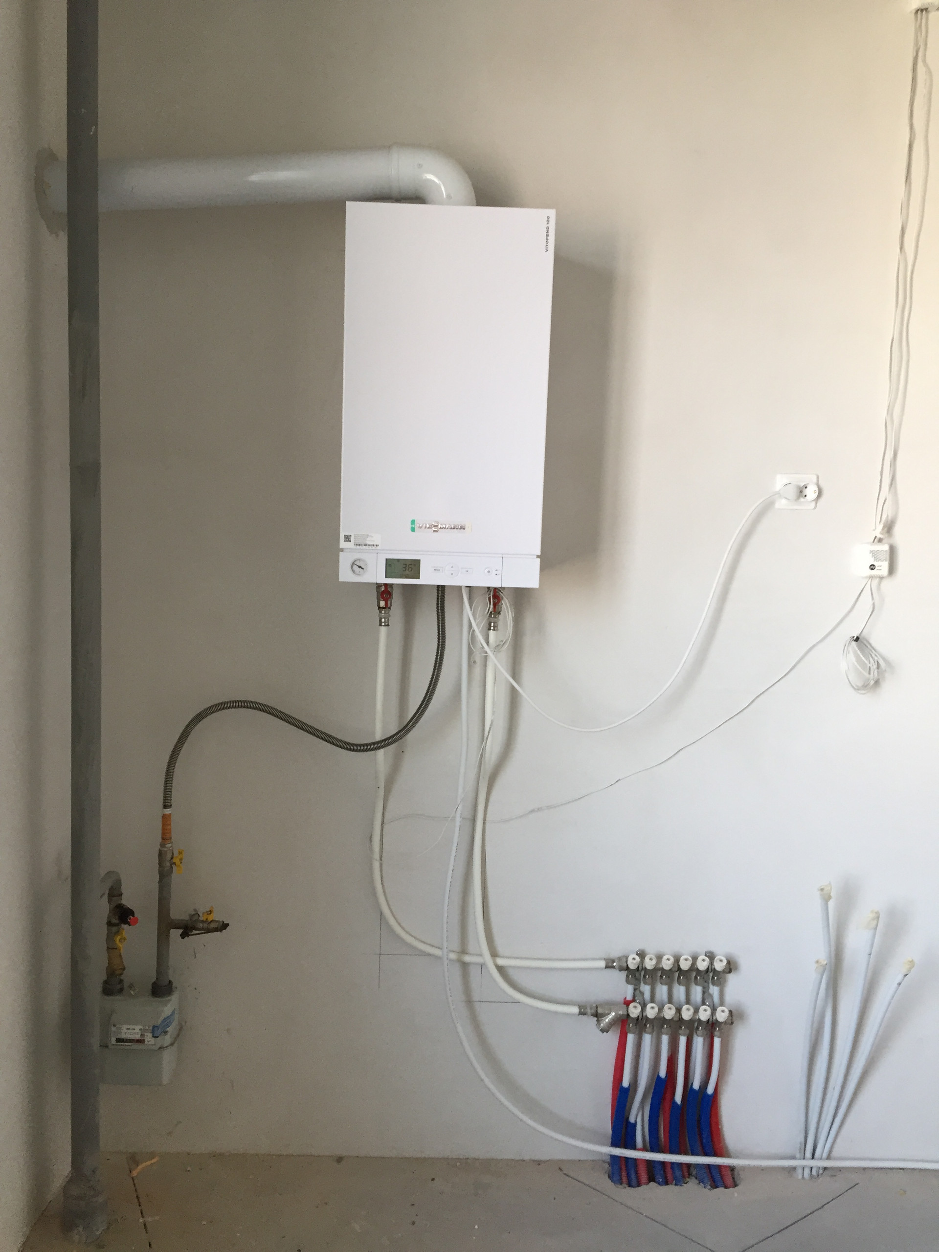 В квартире: хорошая входная металлическая дверь; окна ПВХ, лоджия имеет панорамное остекление (от пола до потолка) выход на лоджию из большой комнаты; смонтирована система электроснабжения, индивидуального отопления от котла; смонтирован теплый пол от котла в санузле, кухне и коридоре (раскладка теплого пола есть на фото); установлены радиаторы отопления Kermi; газовый котел Viessmann (Германия); стены оштукатурены и ошпатлеваны; на полу цементная стяжка; счетчики на газ, воду, свет.
