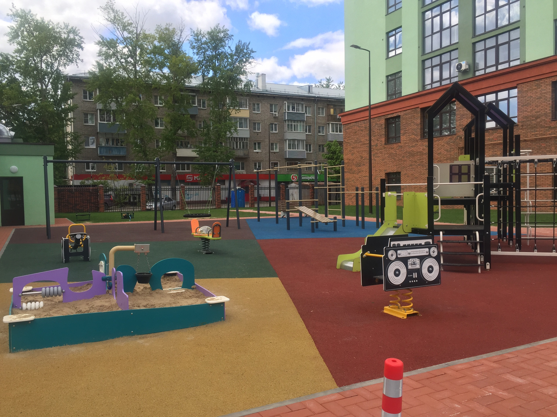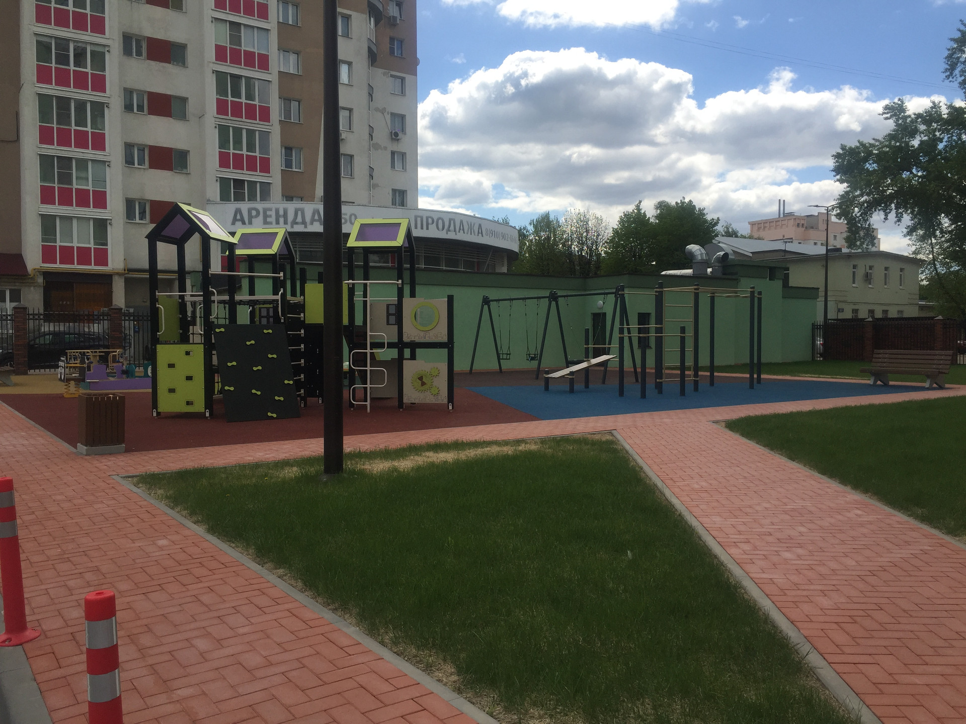Во дворе спортивная/детская площадка. Двое въездных ворот во двор, две калитки, мусорная площадка за пределами двора.