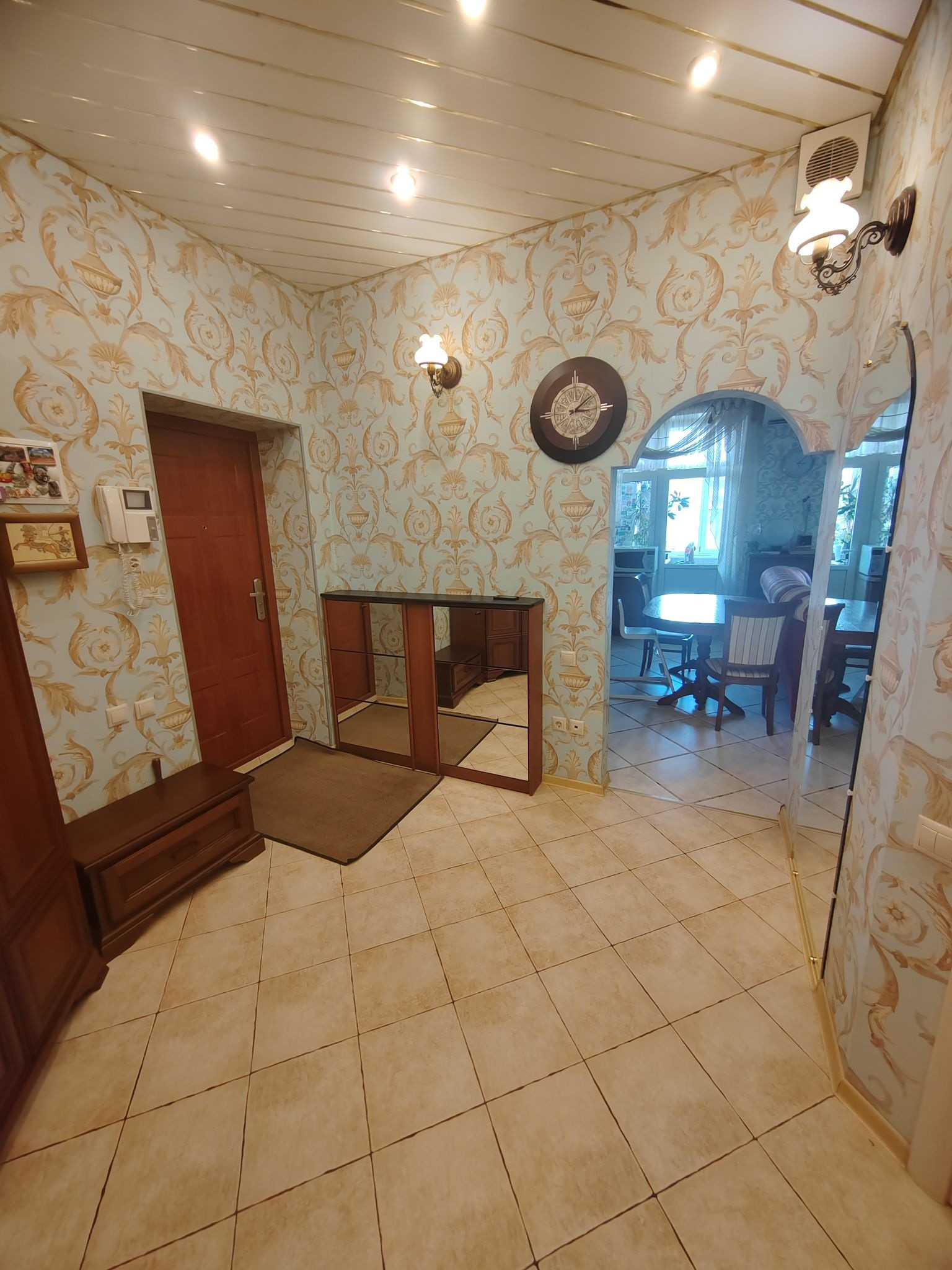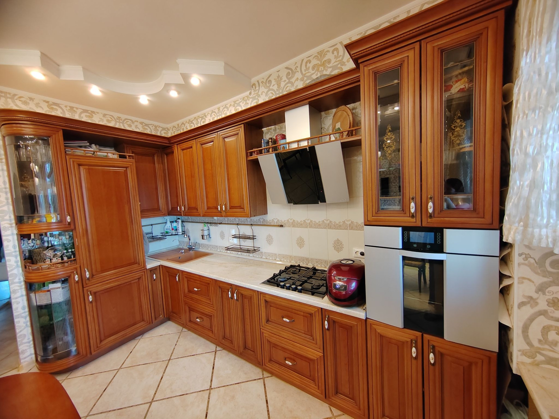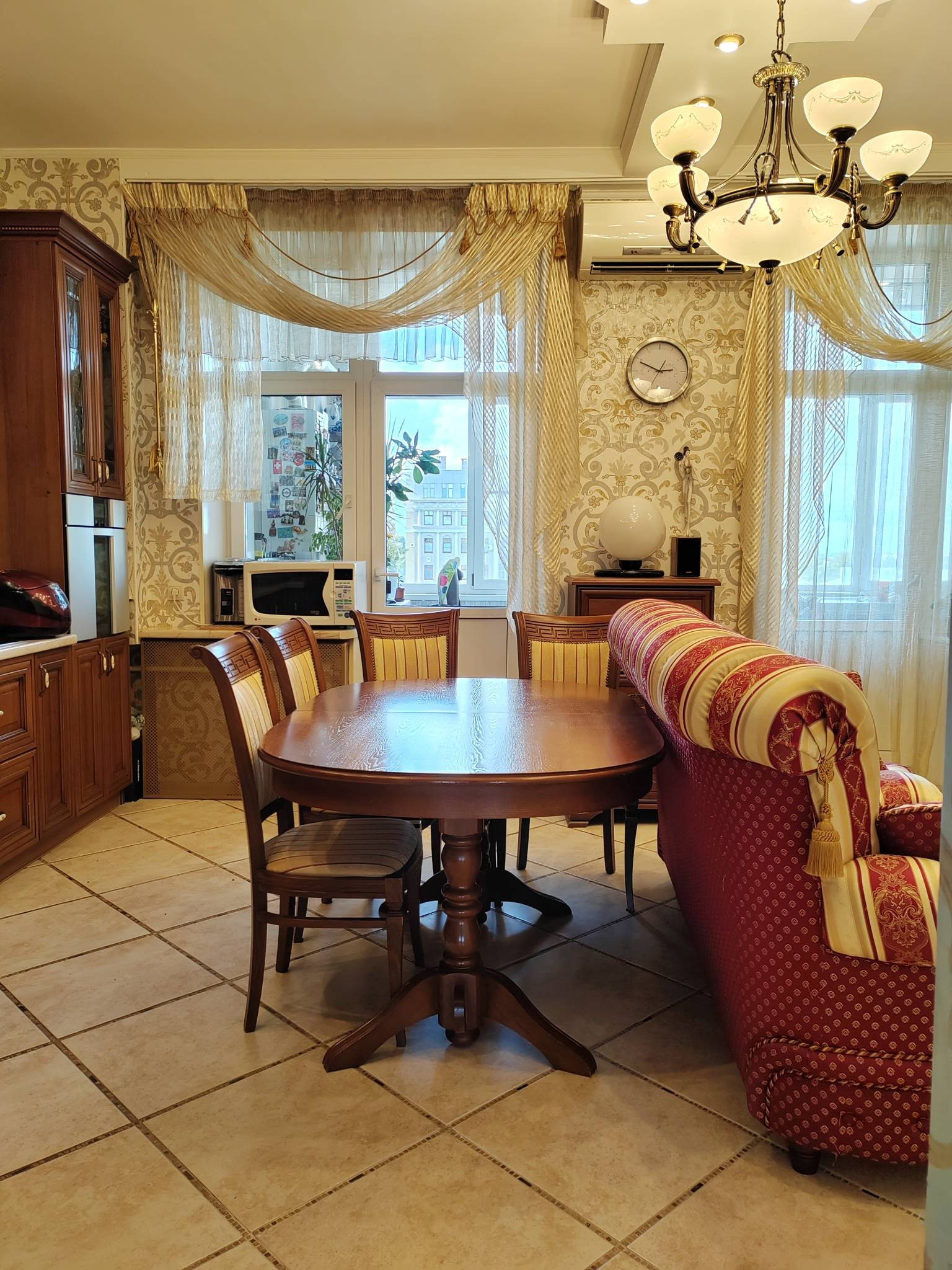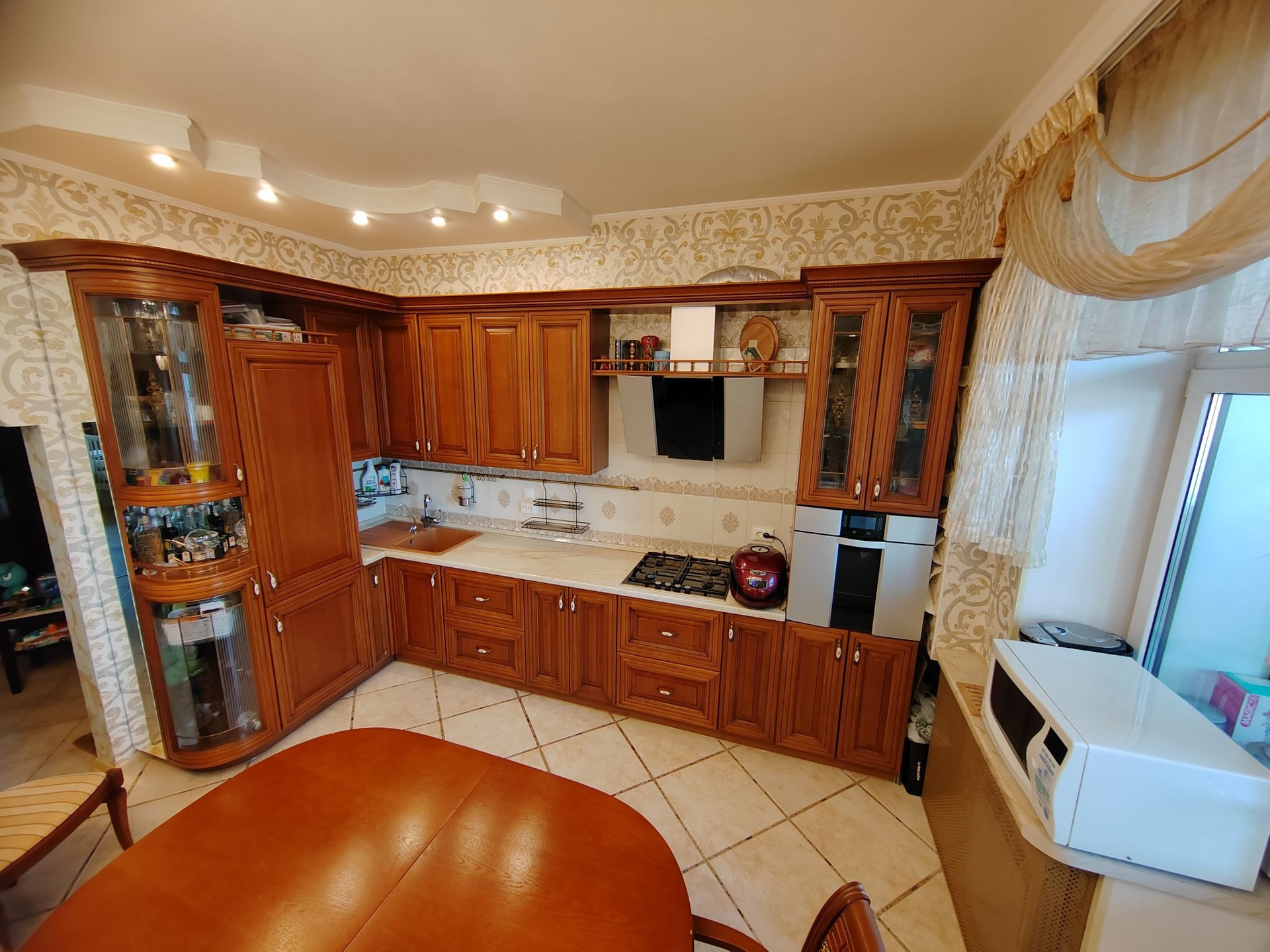 Квартира с полным ремонтом: в комнатах на полу паркетная доска, на кухне, в коридоре и санузлах - плитка на полу, двухуровневые натяжные потолки, высота потолков 3м. Кухня из массива дерева: встроенная посудомоечная машина, встроенный холодильник, варочная панель и духовой шкаф, вытяжка - всё остаётся.