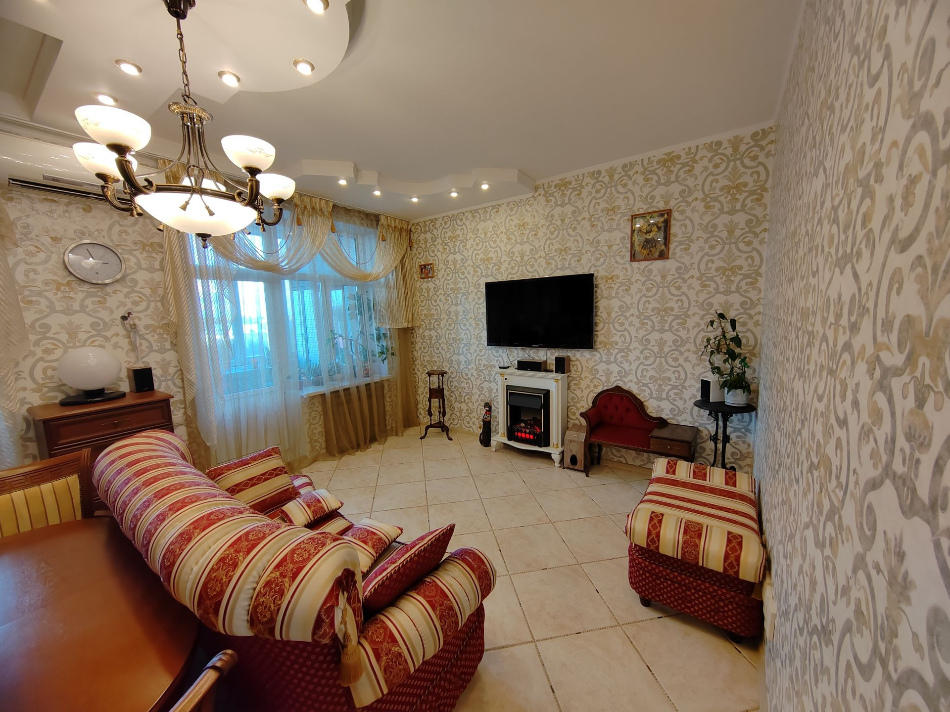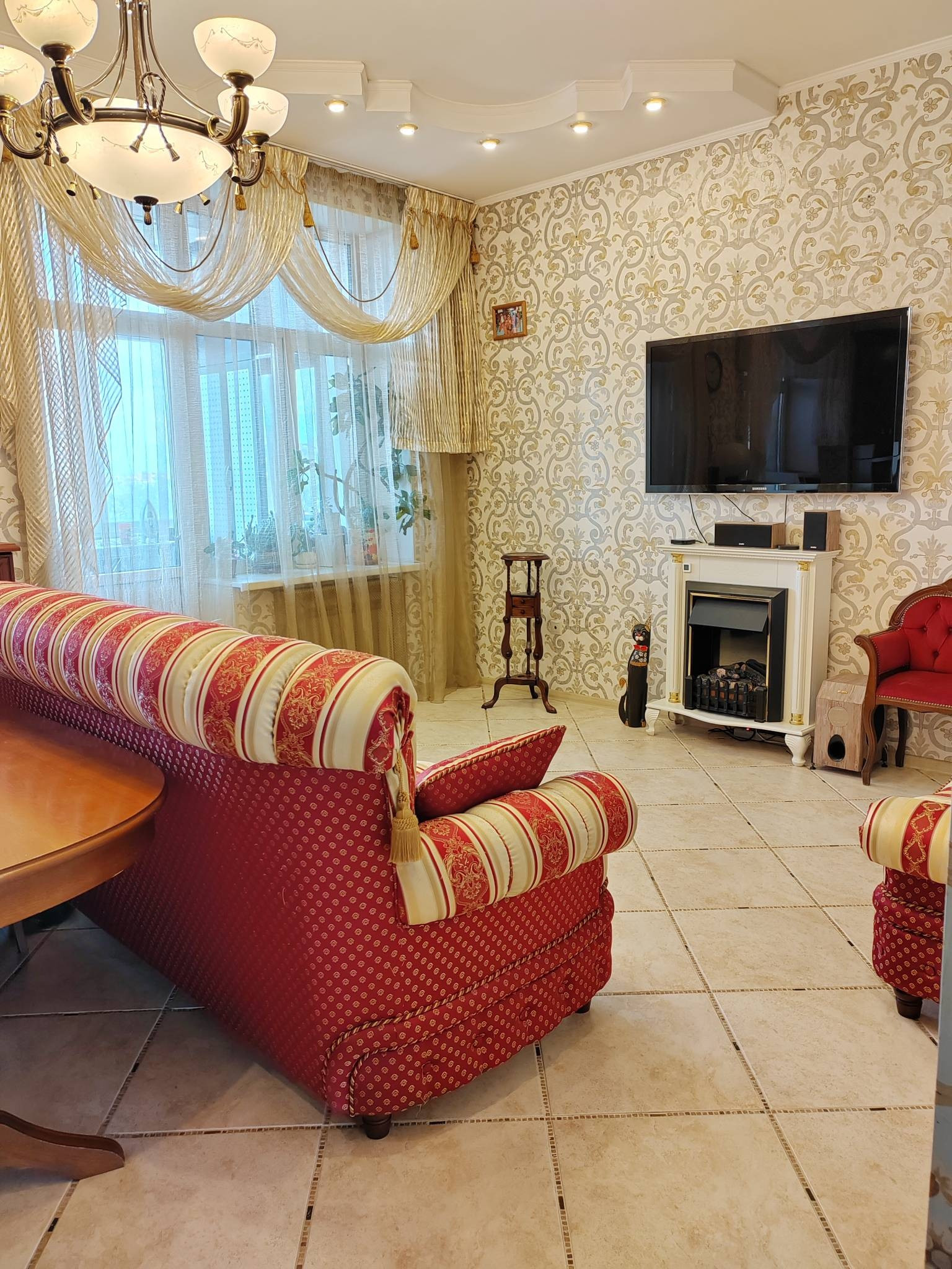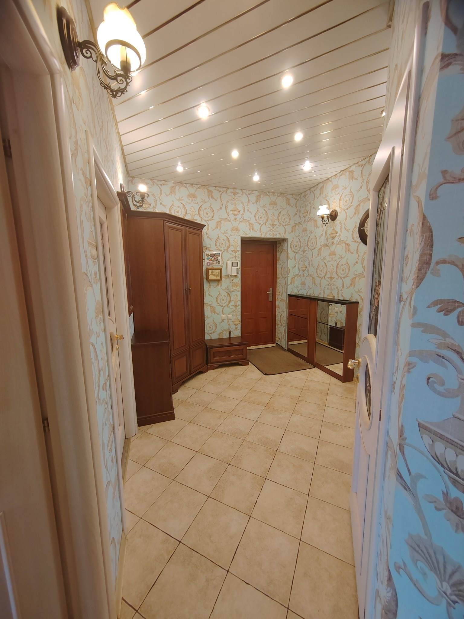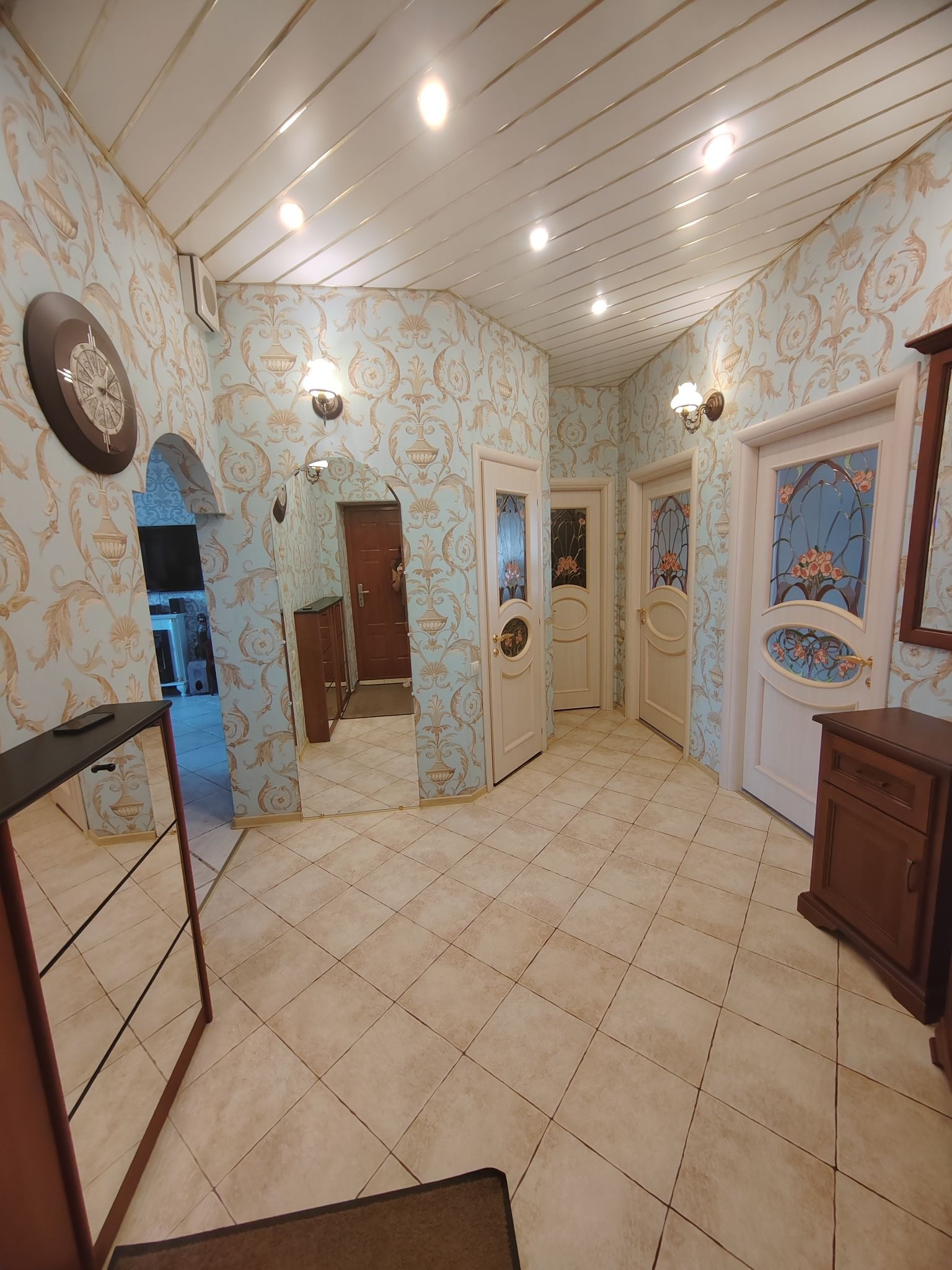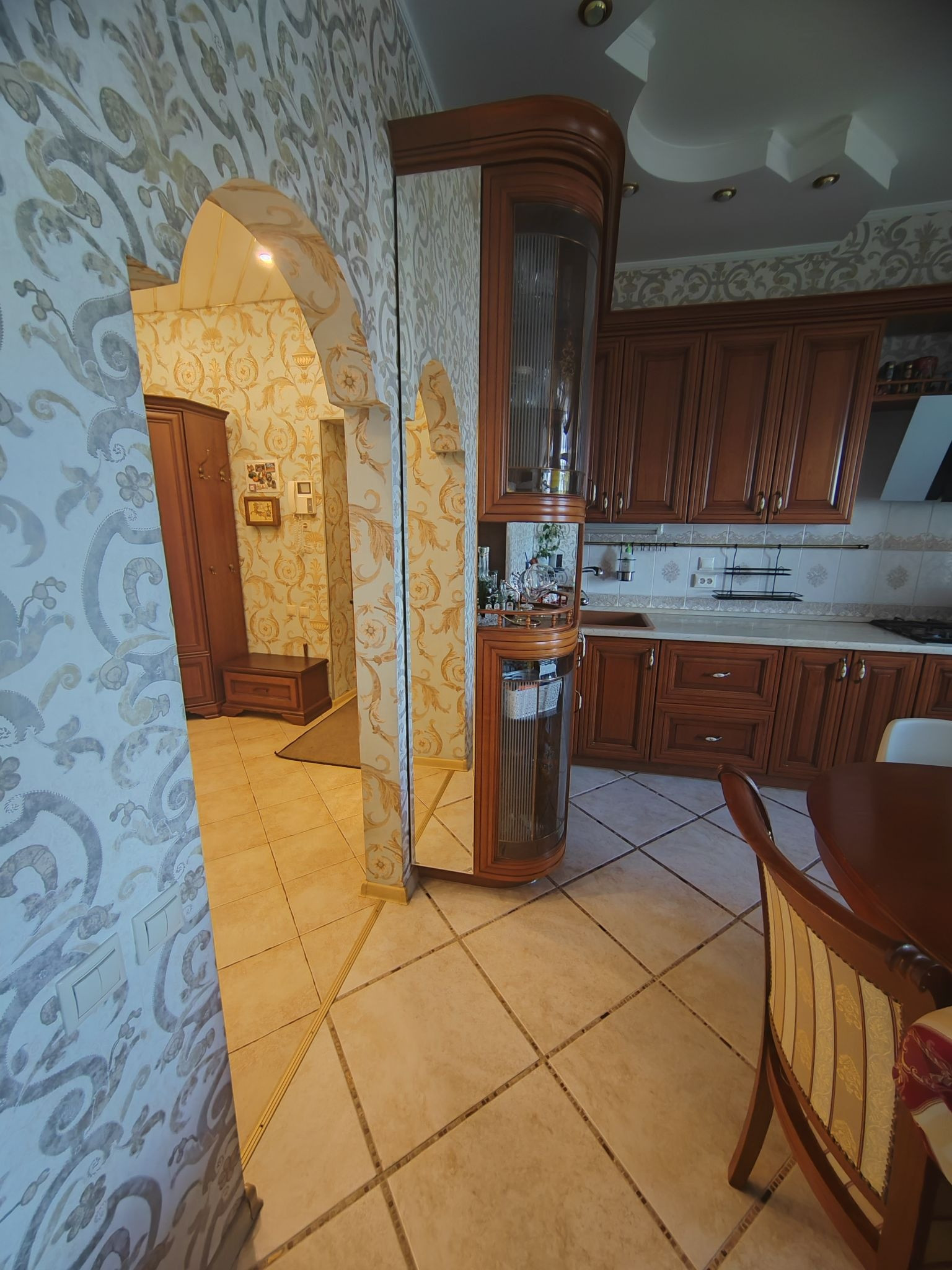 Квартира с полным ремонтом: в комнатах на полу паркетная доска, на кухне, в коридоре и санузлах - плитка на полу, двухуровневые натяжные потолки, высота потолков 3м. Кухня из массива дерева: встроенная посудомоечная машина, встроенный холодильник, варочная панель и духовой шкаф, вытяжка - всё остаётся.