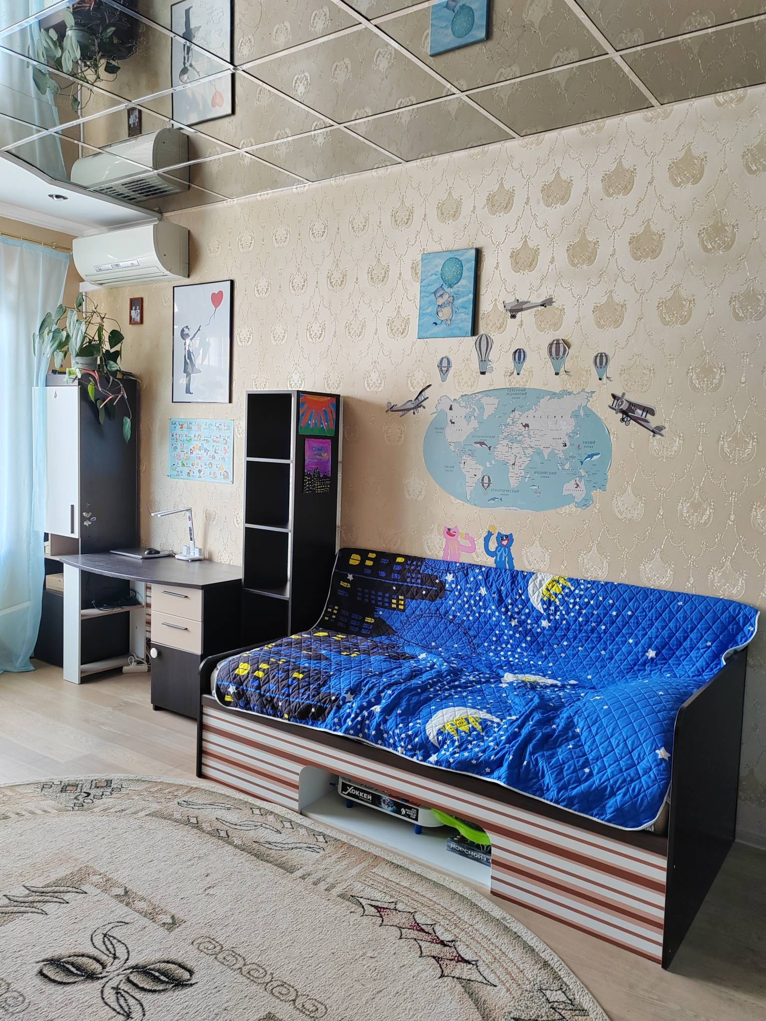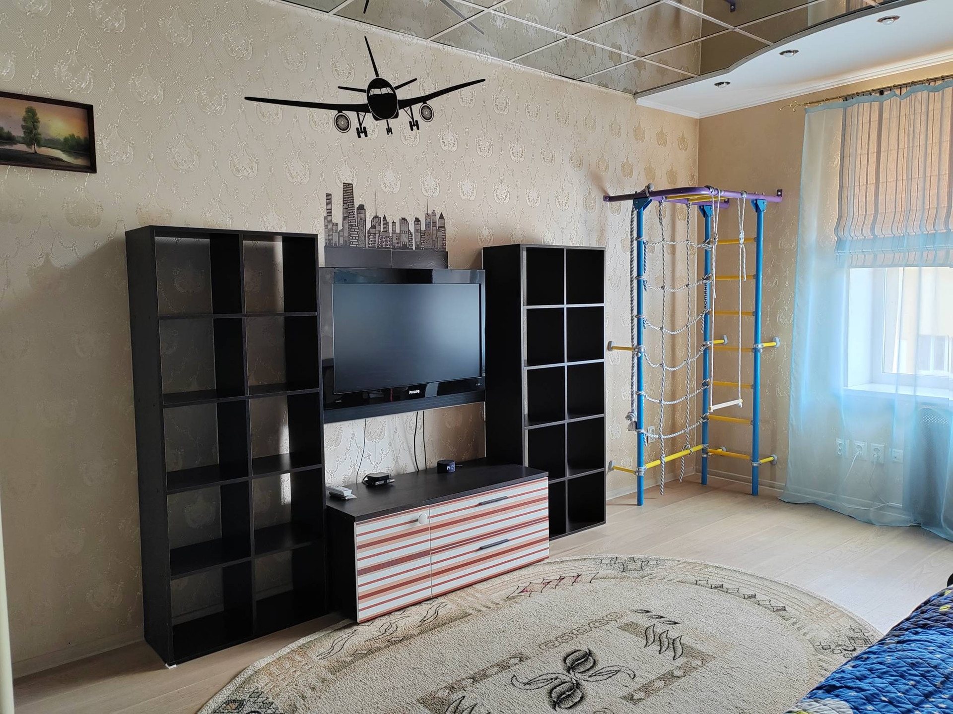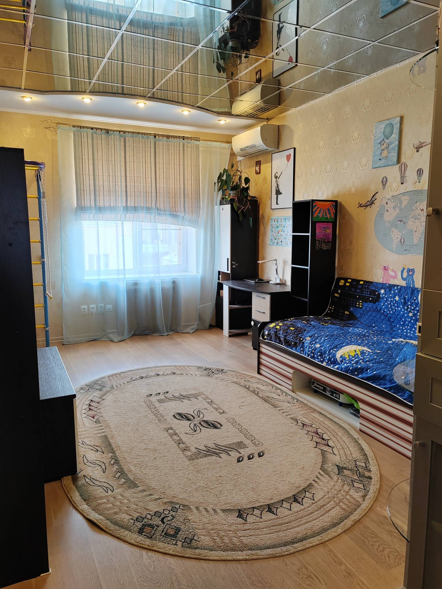 Кухня-гостиная 24,2 кв.м. с выходом на лоджию. Лоджия на 2 окна, утепленная 8,1 кв.м. Две большие комнаты. Детская 19,7 кв.м и спальня 18,3 кв.м. В спальне устроена вместительная гардеробная (3,2кв.м). В детской вместительный шкаф купе, на стенах декоративные наклейки с лёгкостью снимаются.
