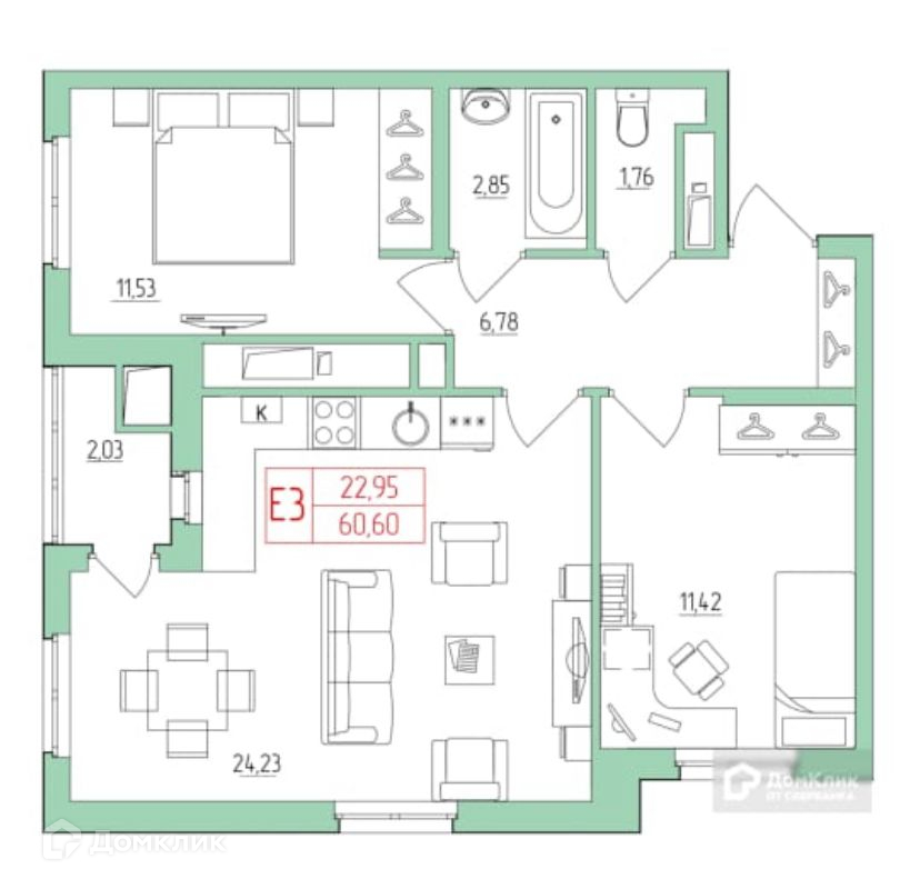 Жилая площадь 22.95 м2