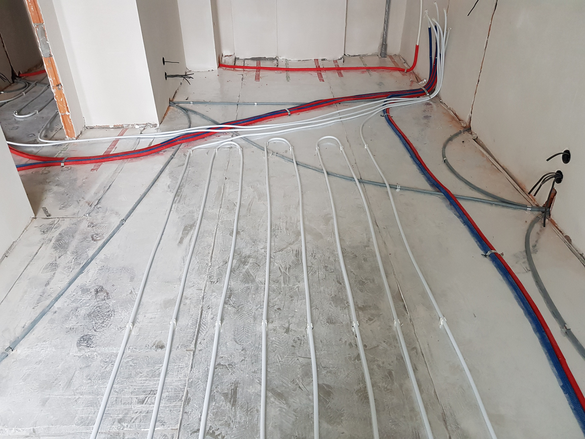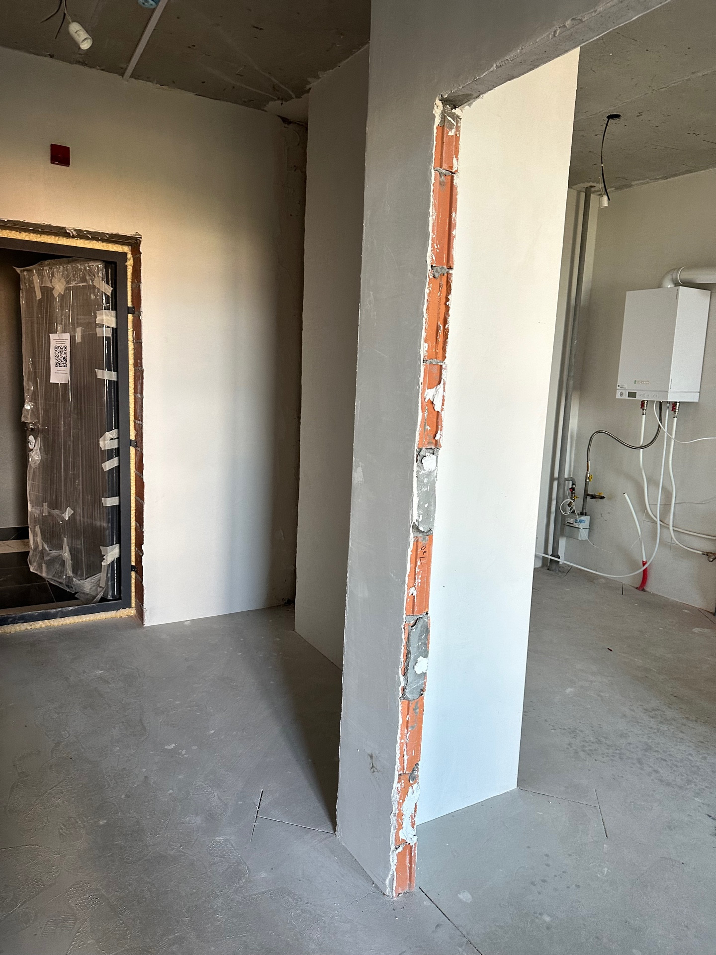 В квартире установлена качественная дорогостоящая входная дверь, окна ПВХ, смонтирована система электроснабжения, система индивидуального отопления, смонтирован теплый пол в кухне, сан/узле, коридоре (фото разводки теплого пола прилагается), установлены радиаторы отопления, германский газовый котел Viessmann, стены оштукатурены и ошпатлеваны, на полу стяжка, счетчики на газ, воду, свет.