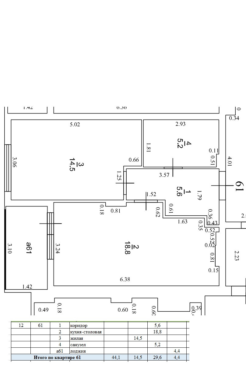 Этаж 12/15, общая площадь без учета лоджии-44,0 кв м, с учетом площади лоджии-48,5 кв м, жилая-14,4 кв м, просторная кухня-столовая -18,8 кв м, лоджия 4,5 кв м, один с/у совмещенный просторный-5,2 кв м, коридор -5,6 кв м,