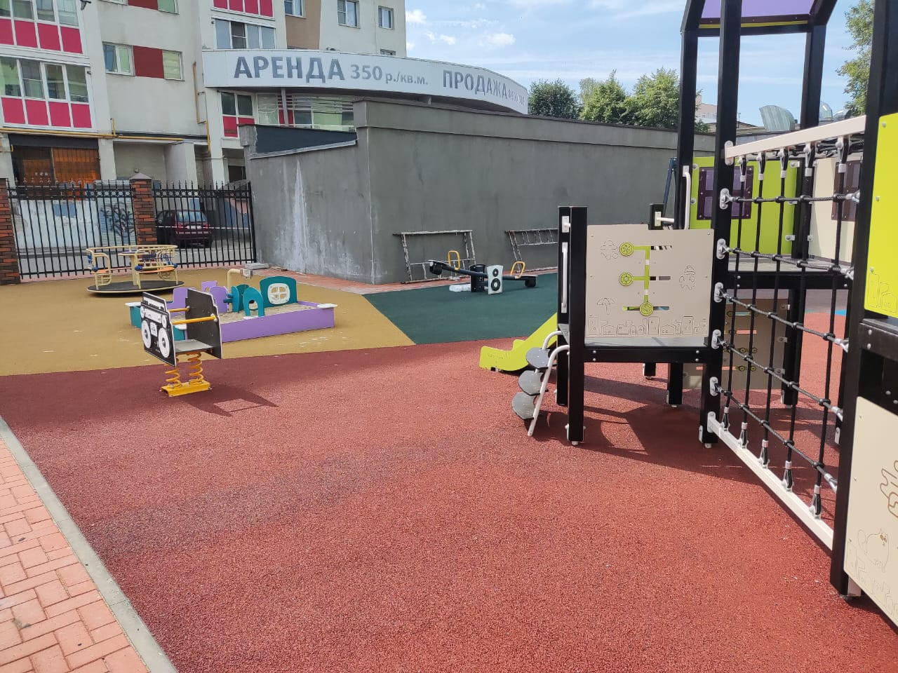 Во дворе спортивная площадка с тренажерами и детская площадка.