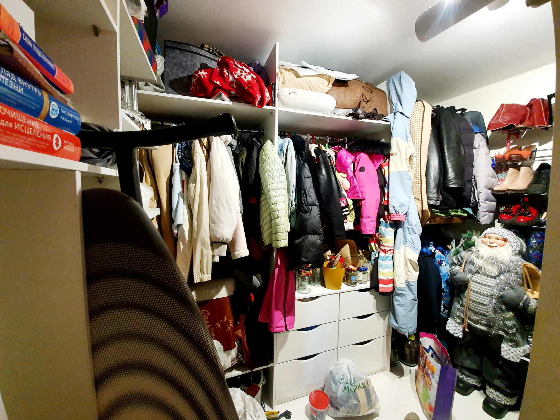 Гардеробная ( 6.5кв.м) укомплектована полками и вешалками.