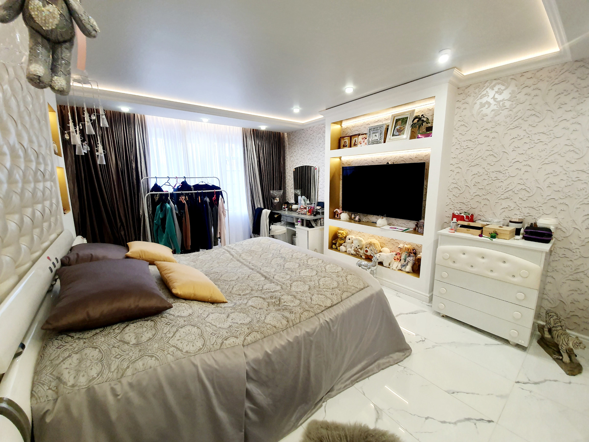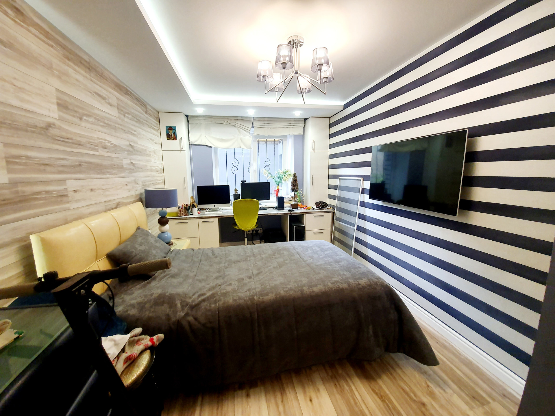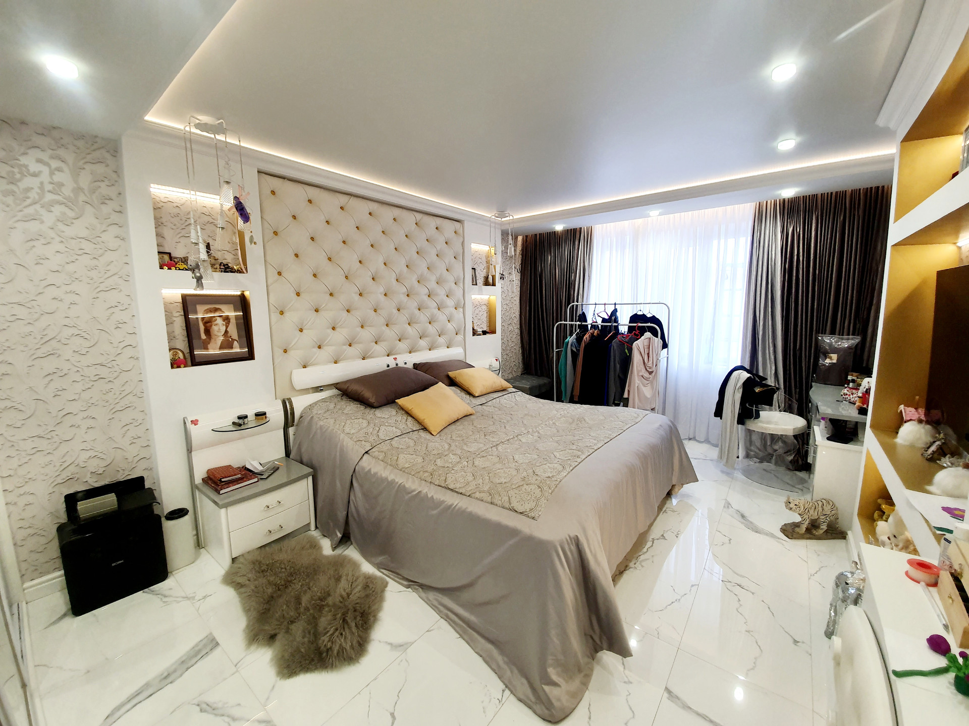 –Спальня 1 : 20кв.м : полы -дорогая итальянская плитка + качественные обои на стенах , изголовье -эко кожа.
