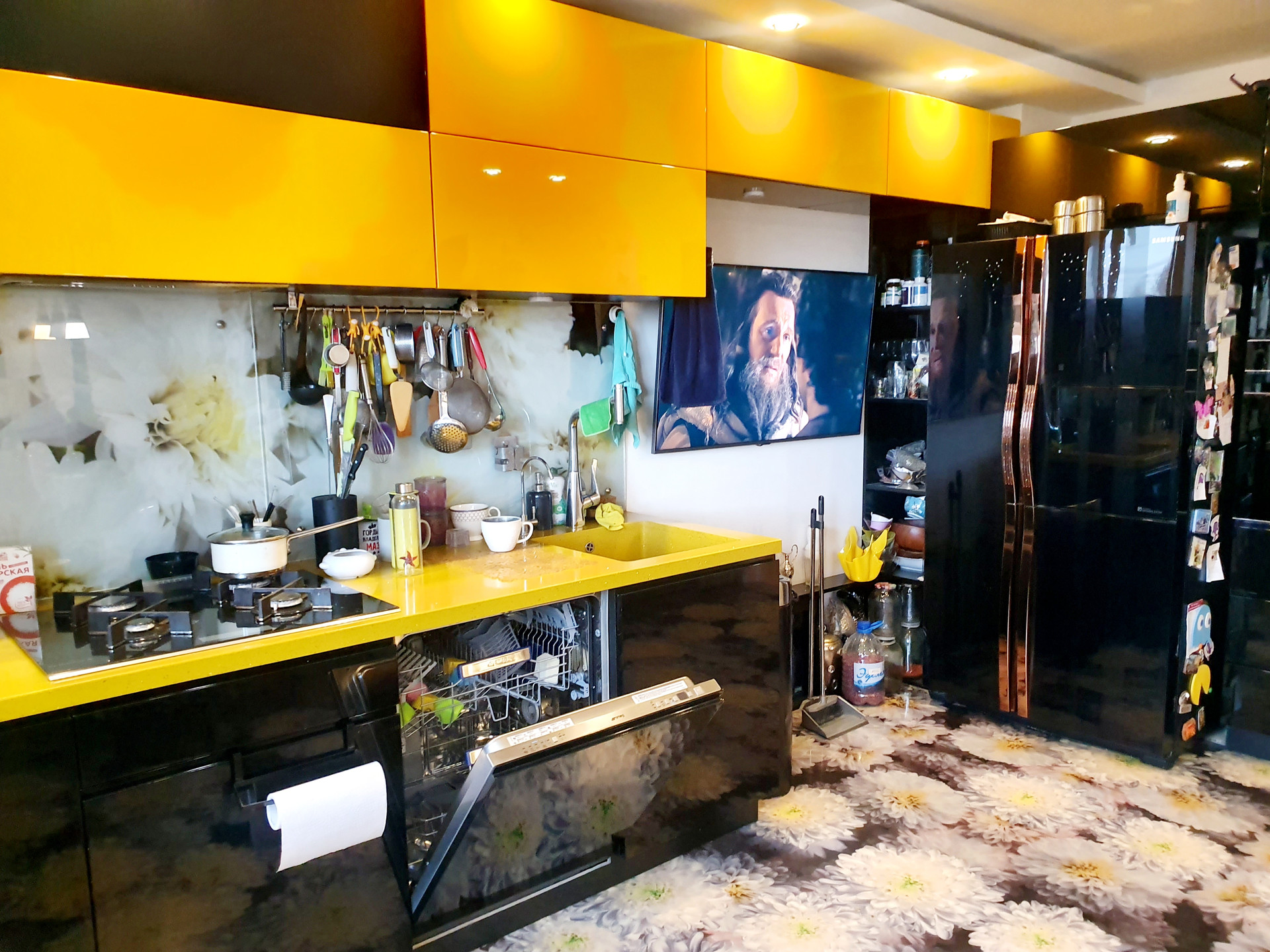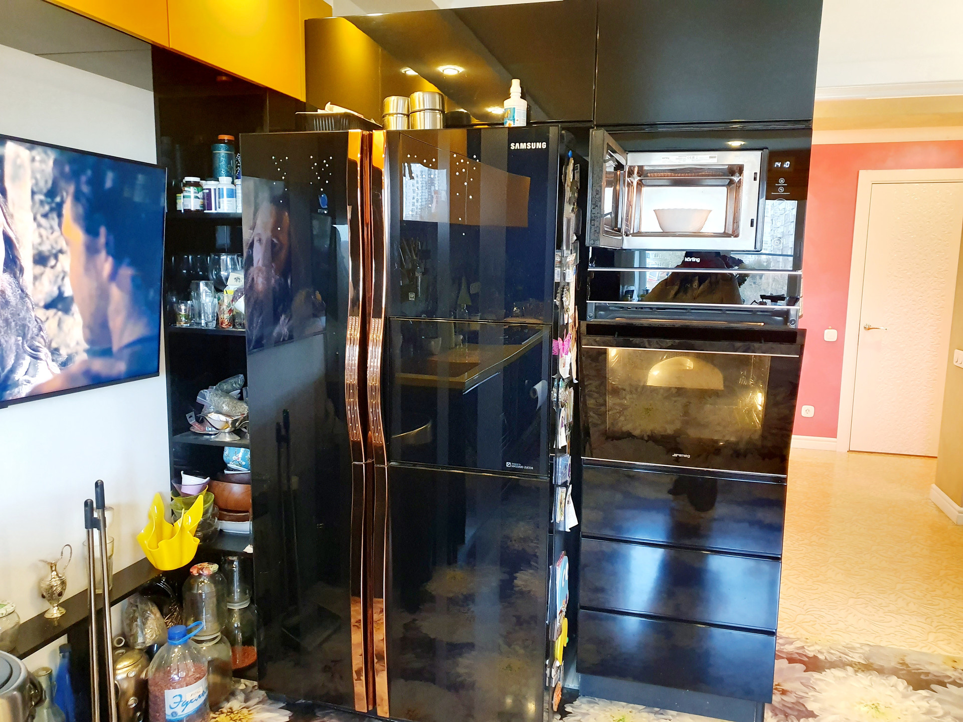 -Кухня-столовая (20 кВ.м) со встроенной техникой премиум класса ( Smeg, Samsung) Газовая панель сенсорная De Dietrich. Рабочая поверхность столешницы - натуральная кварцевая панель. Неубиваемый материал, сверхпрочный , на котором можно резать и ставить горячее без подставок , при этом она не царапается и не трескается. Раковина выполнена из аналогичного материала. Все шкафчики в кухонном гарнитуре снабжены системой