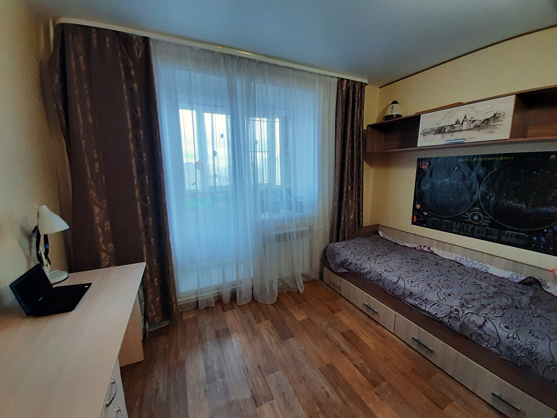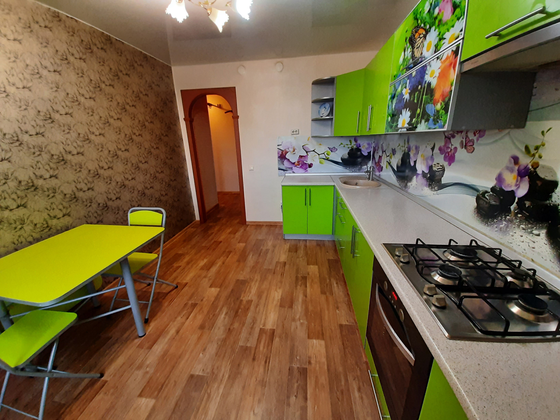 Продаётся 1-комнатная квартира в кирпичном доме. Теплая и светлая. В стоимость входит кухонный гарнитур, некоторая мебель и бытовая техника. Очень удачная и практичная планировка: в гостиной создано «детское пространство», с диваном и письменным столом. Кухня более 11кв.м, фасады оформлены в весёлых летних тонах.  В коридоре расположен встроенный шкаф-купе для верхней одежды. Сантехника в хорошем состоянии. Выход на балкон из гостиной. Отличный вид из окна.