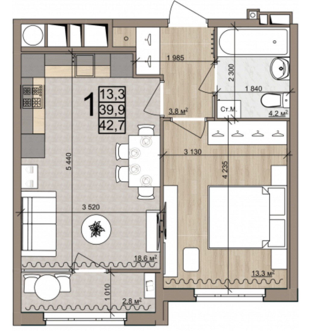 Балкон, лоджия 1 балкон
