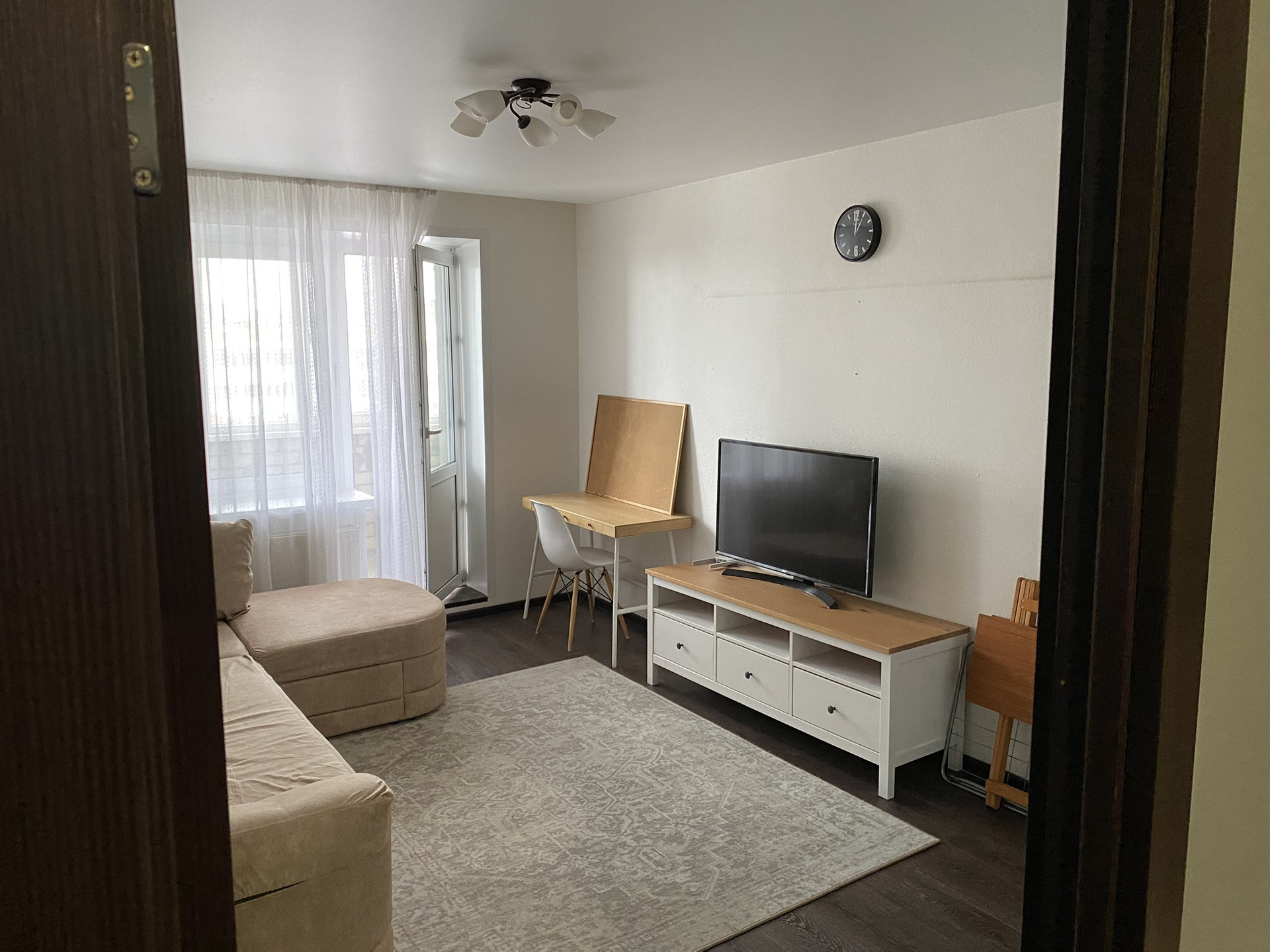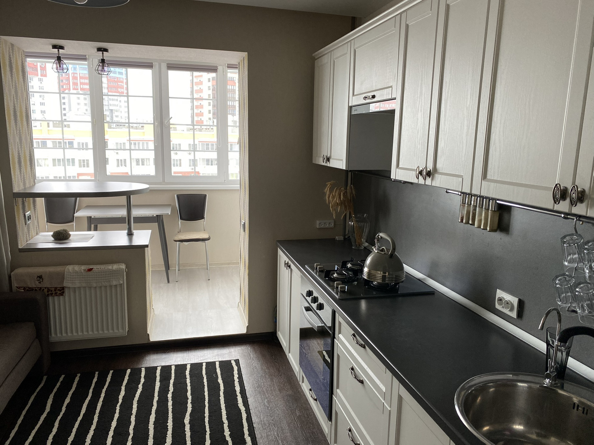 Есть неотделанный балкон в зале (3м2). Балкон на кухне утеплен и совмещен с кухней, поэтому она стала просторней. Есть зона отдыха с ракладным диваном и зона с кухонным столом на балконе. Квартира очень теплая, зимой батареи кипяток, я часто их перекрываю или убавляю, так как жарко.