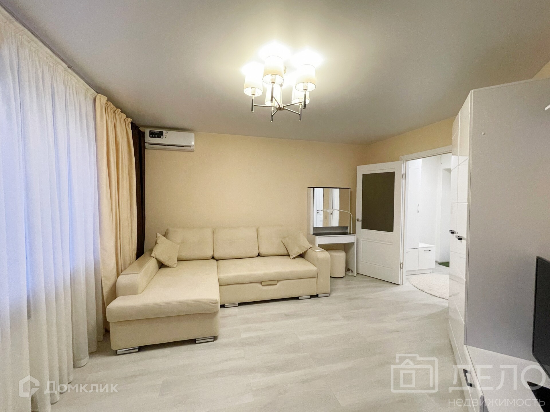 Квартира 43 (с лоджией)/38,9/17,3/12 с отличным ремонтом. Остаётся встроенная кухня с духовым шкафом, варочной панелью и вытяжкой, встроенный шкаф в комнате, прихожая, шторы, люстры, кондиционер.