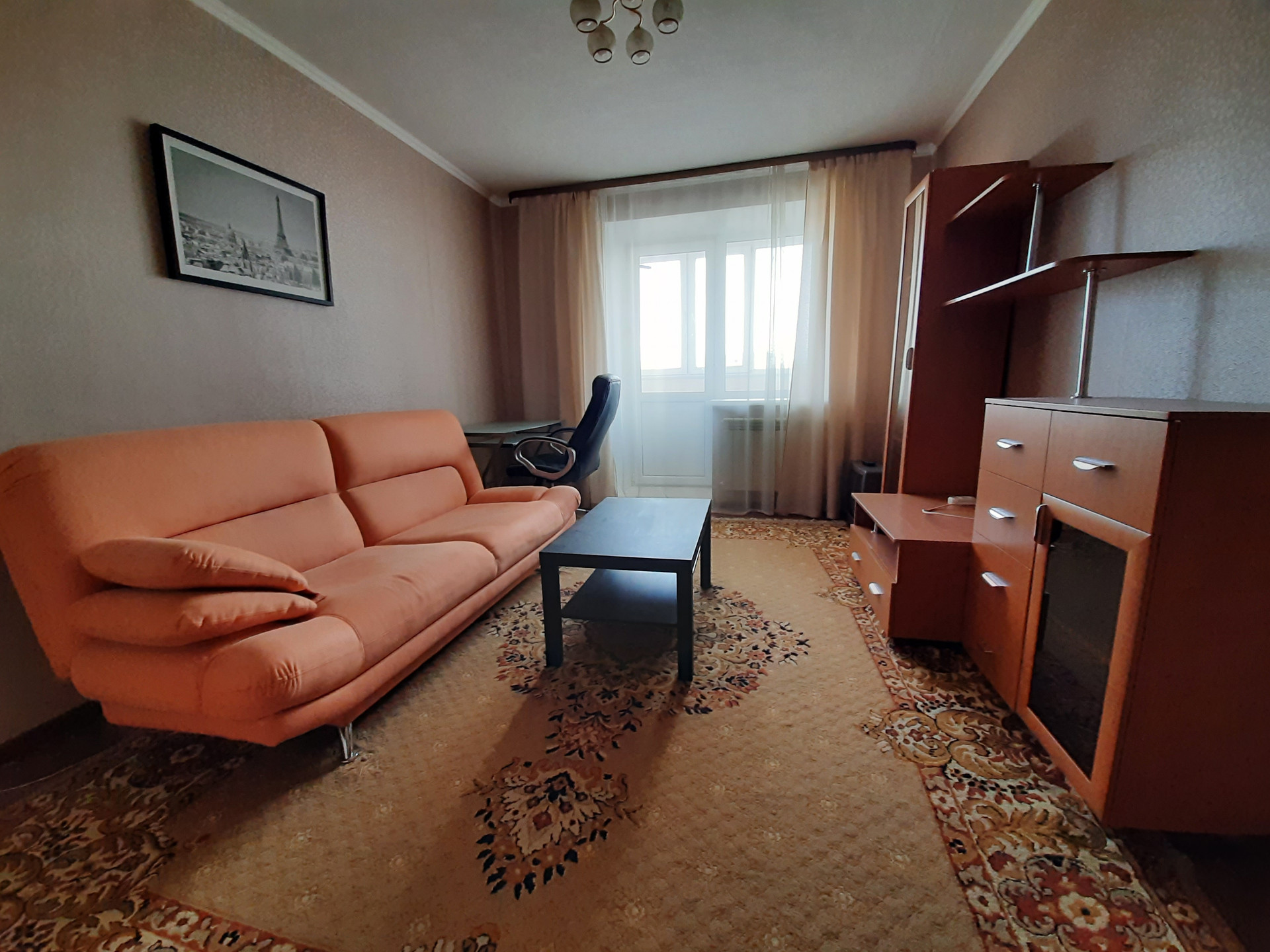 в гостиной создано пространство, с диваном и письменным столом, выход на лоджию.