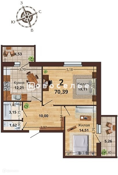 Общая площадь 70.4 м2