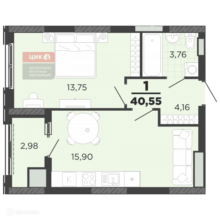Общая площадь 40.55 м2