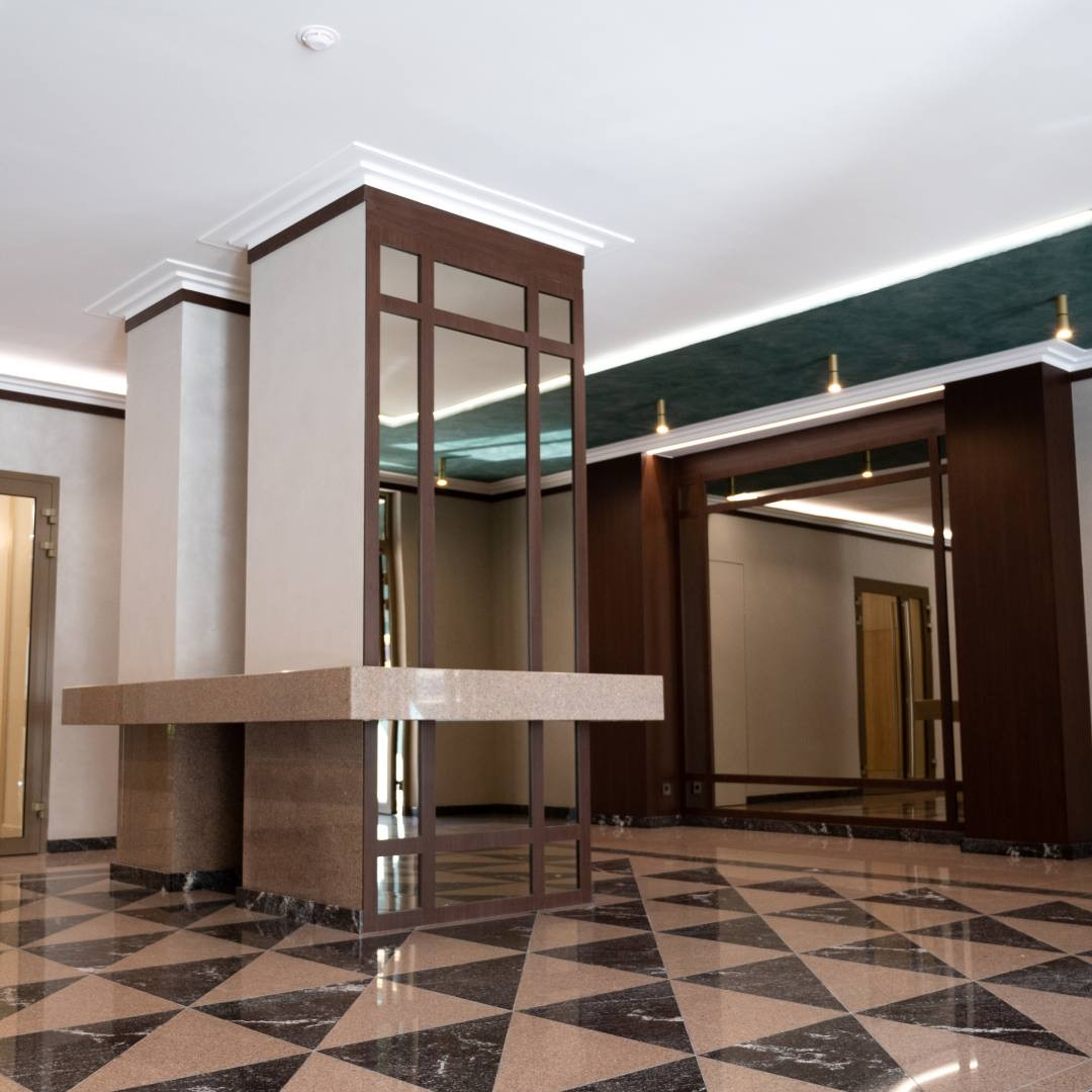 ▫️Входные холлы на первом этаже облицованы натуральным гранитом, стойким к механическим воздействиям.