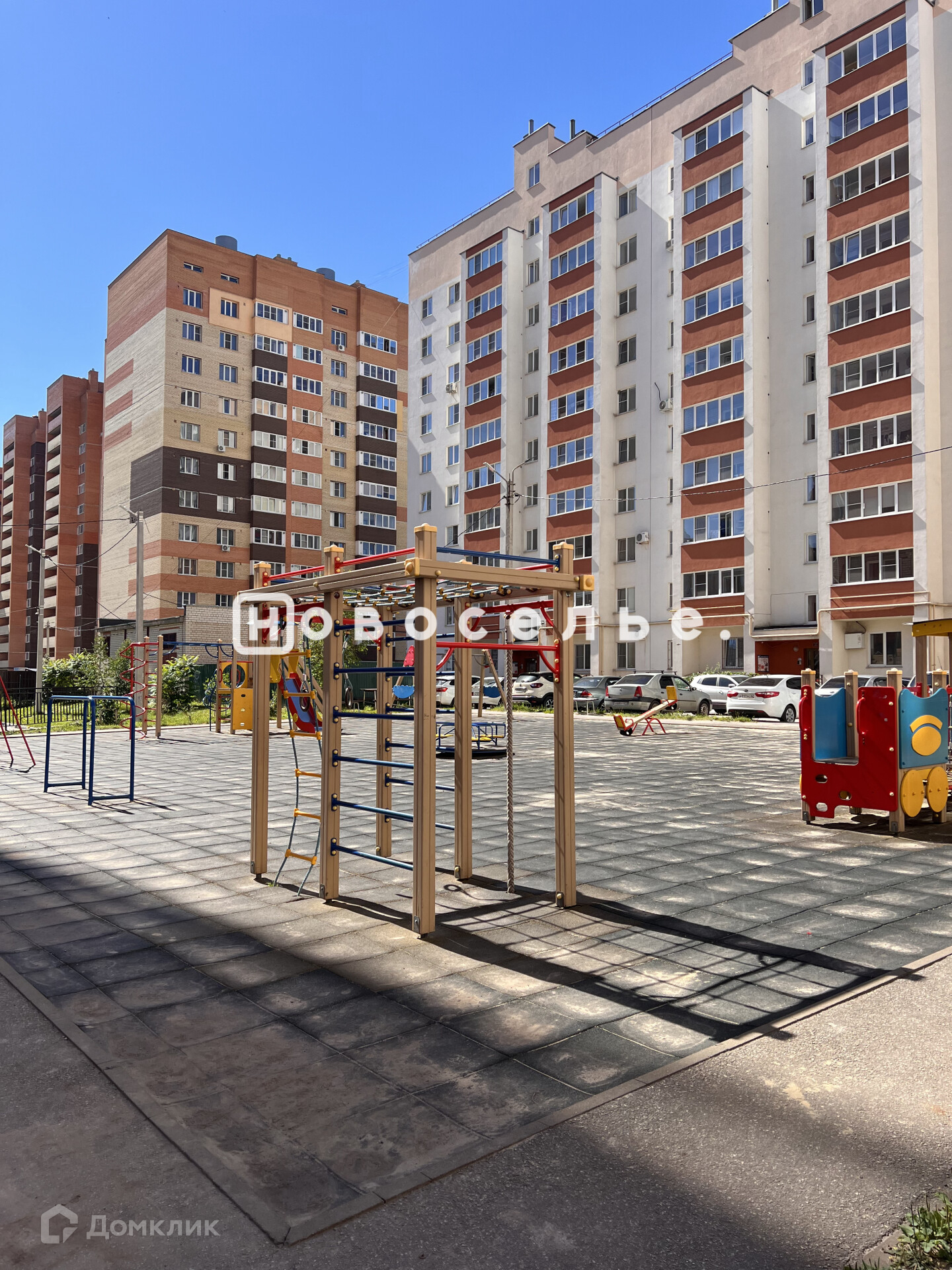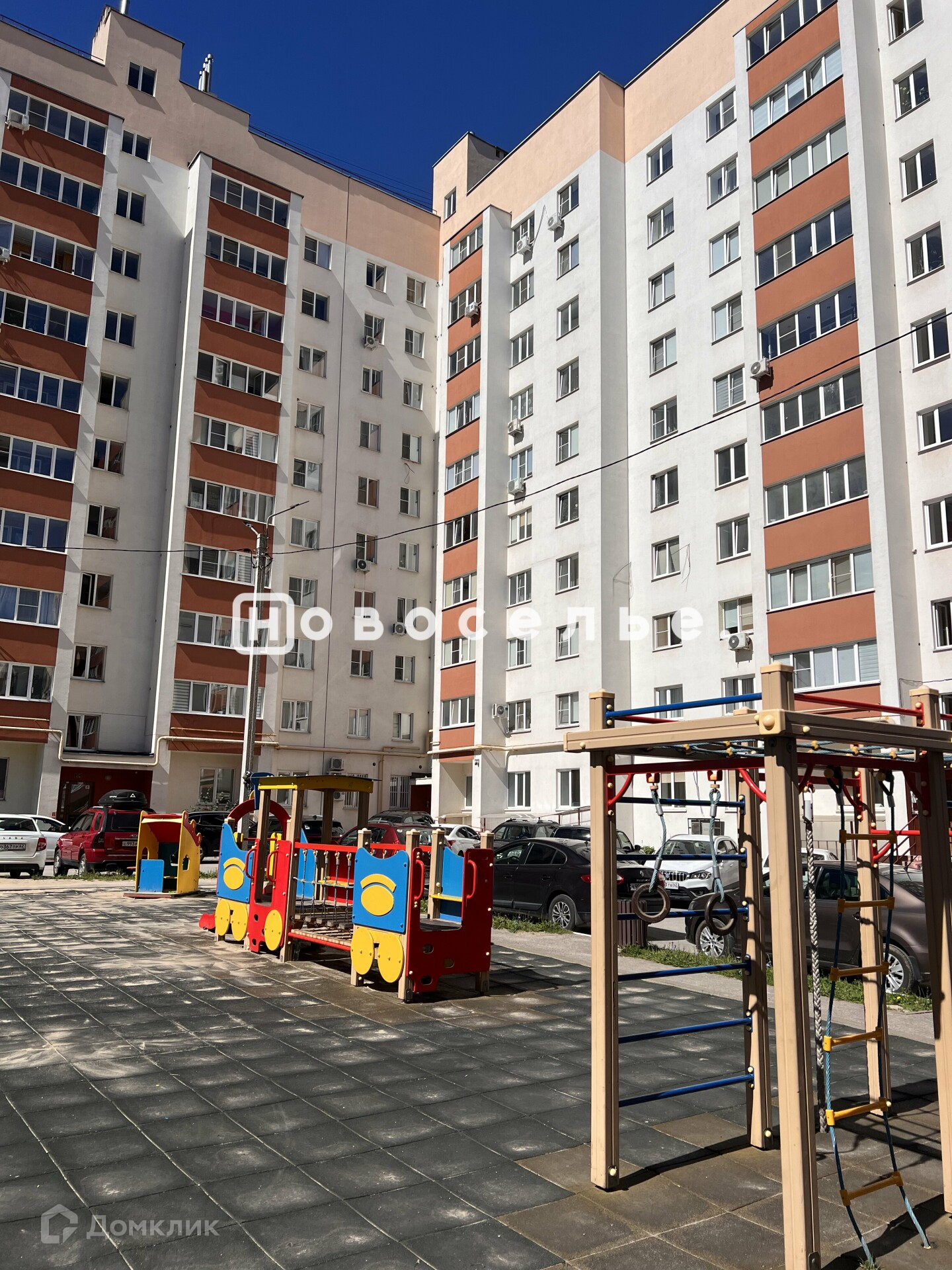 Дом с закрытой территорией, своей парковкой под шлагбаумом и функциональной детской площадкой.