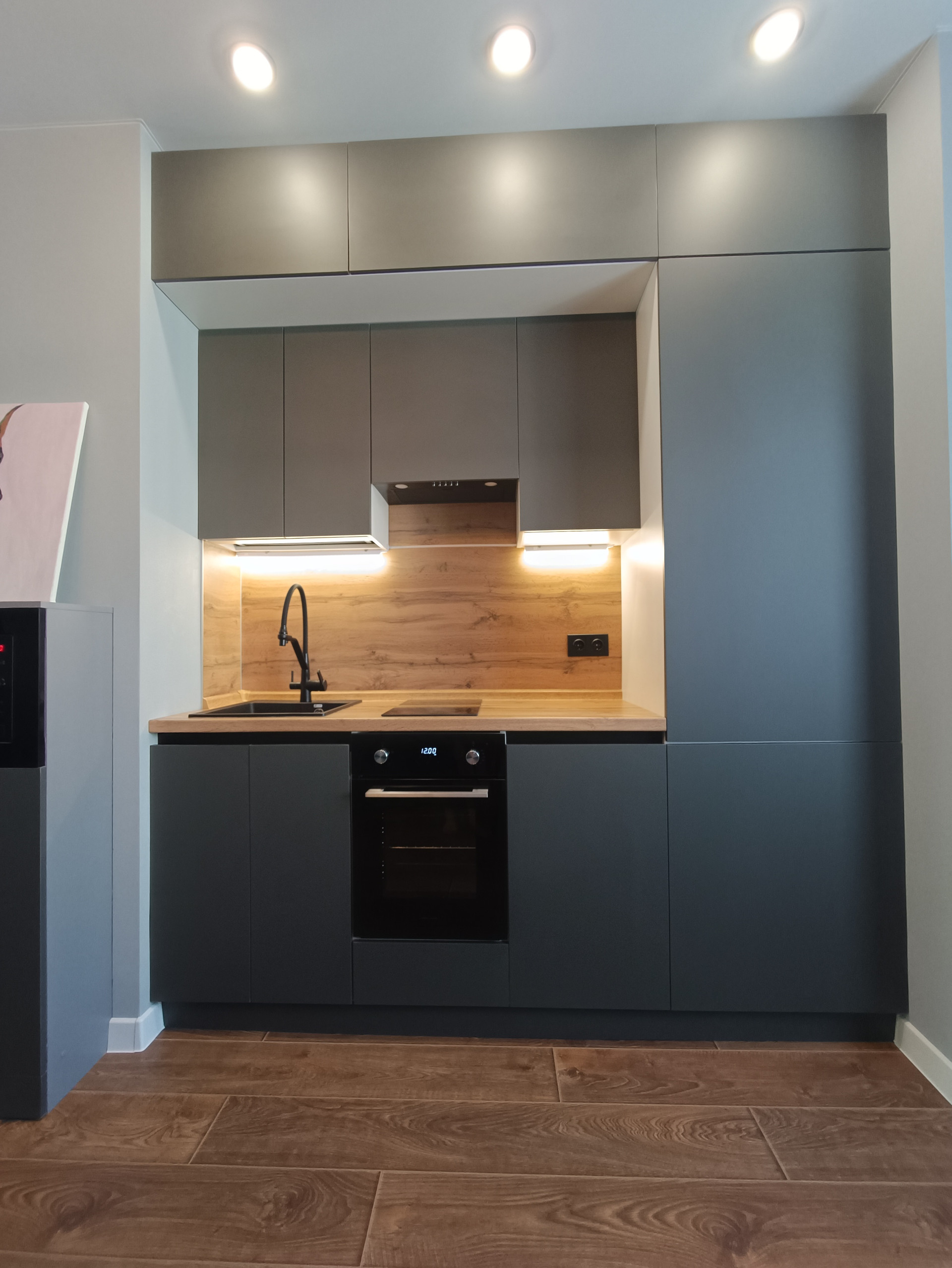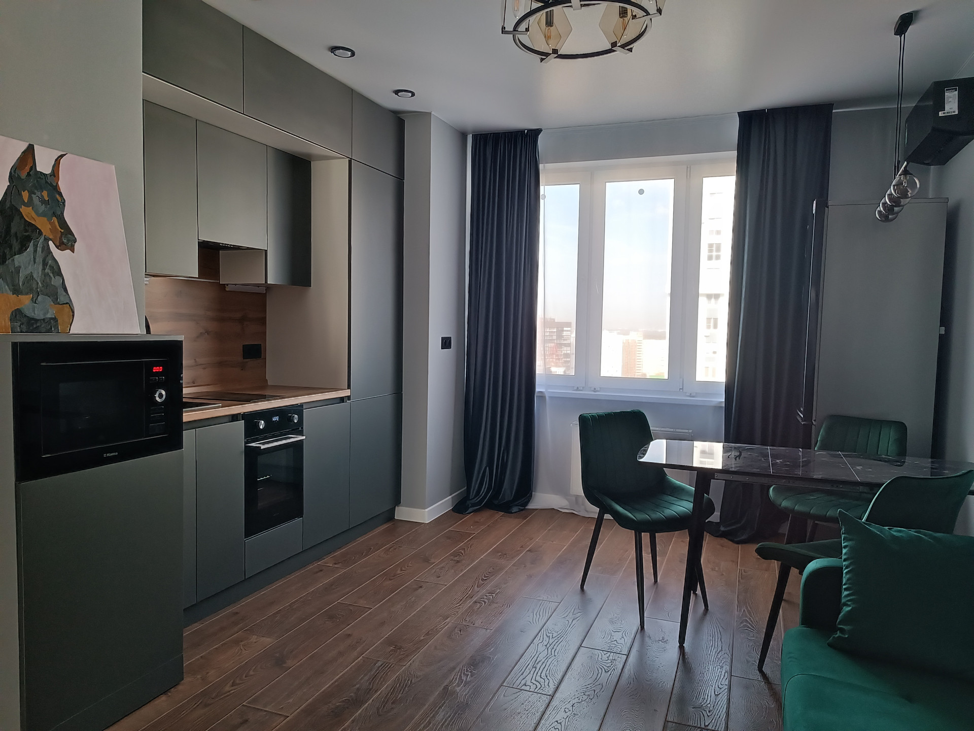 - кухня-гостиная площадью 20 кв.м., полностью оборудована по самым современным тенденциям: встроенный кухонный гарнитур со всей необходимой техникой, обеденная зона, зонирование светом,