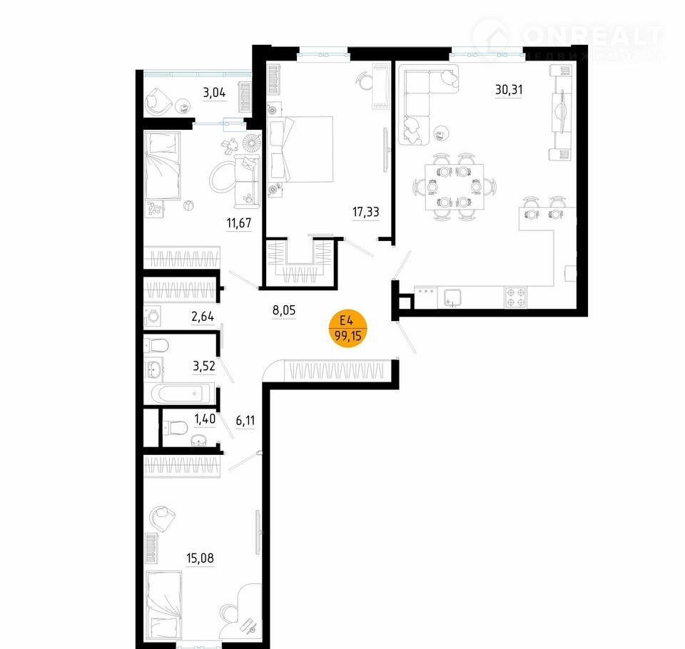 3-комнатная кваpтиpа — 99,15 м²