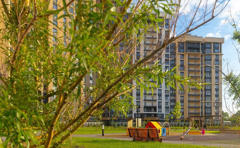 Закрытый двор без машин, современная детская площадка и прогулочные зоны