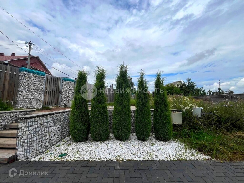 Участок огорожен забором с подцветкой из натурального дерева и габионов с белым мрамором. Зона для строительства жилого дома выделена так, чтобы она не мешала вашему отдыху.
