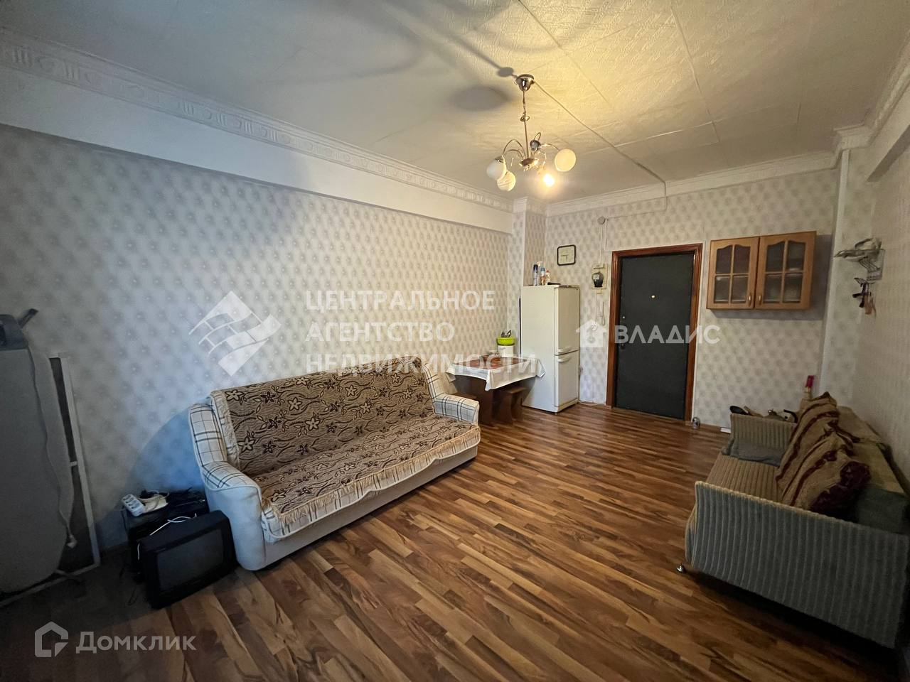 В комнате есть: телевизор, стол, диван, холодильник.