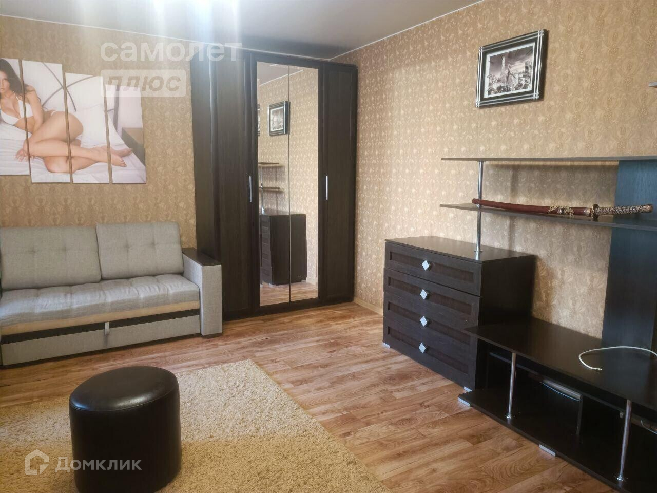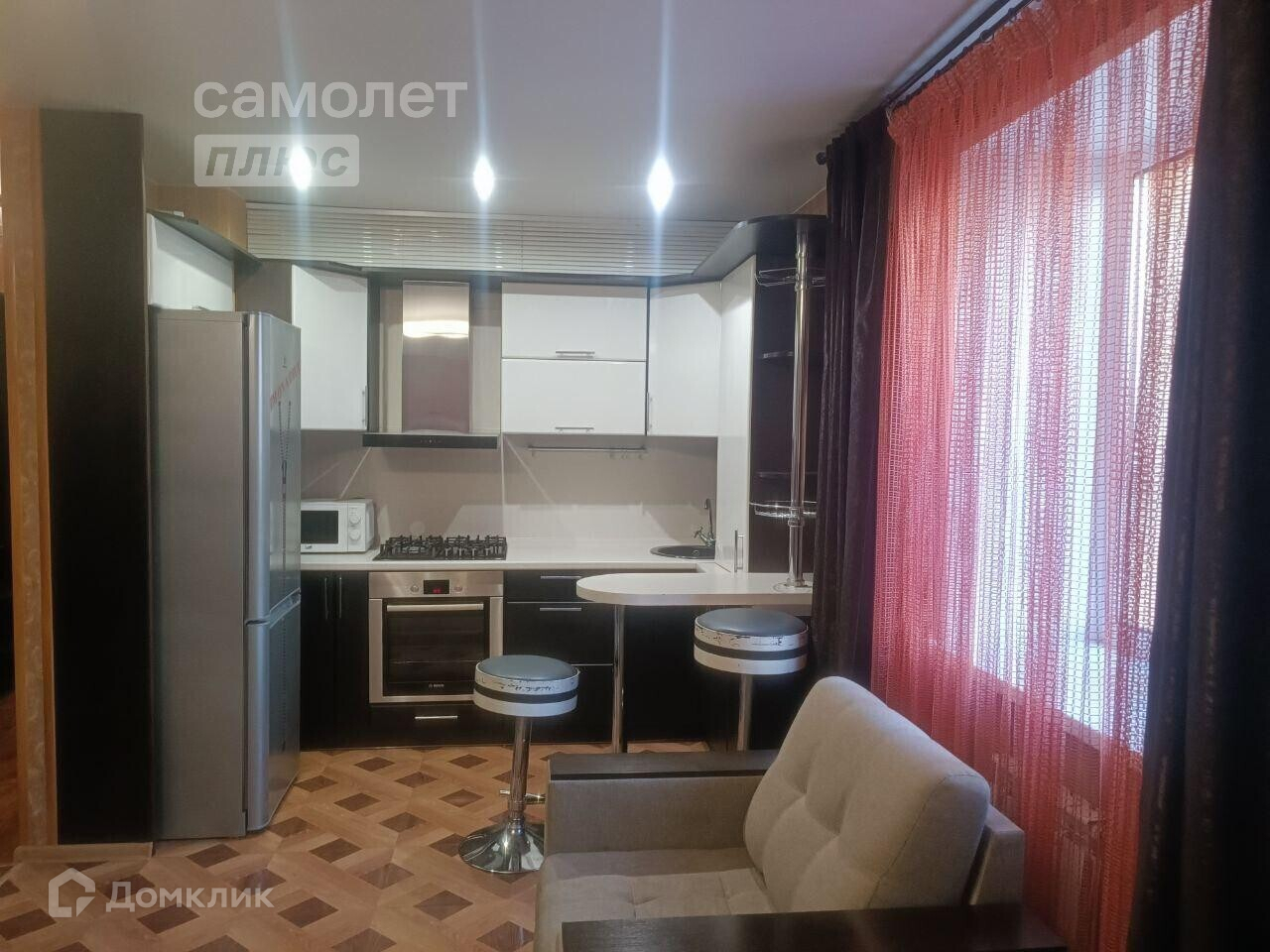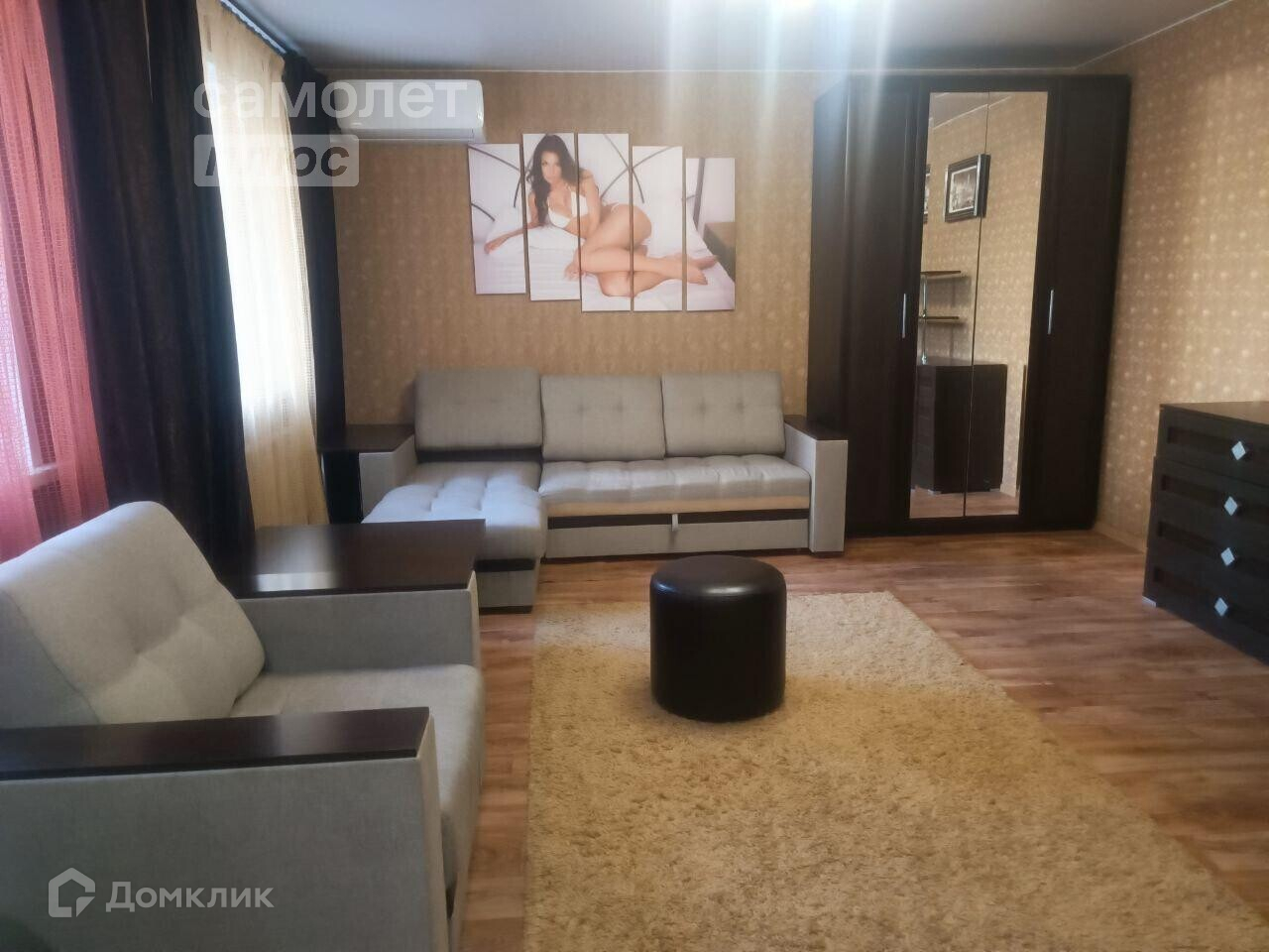 Установлен диван, кухонный гарнитур, кухонный стол, холодильник, кондиционер, варочная панель, духовой шкаф,чайник.