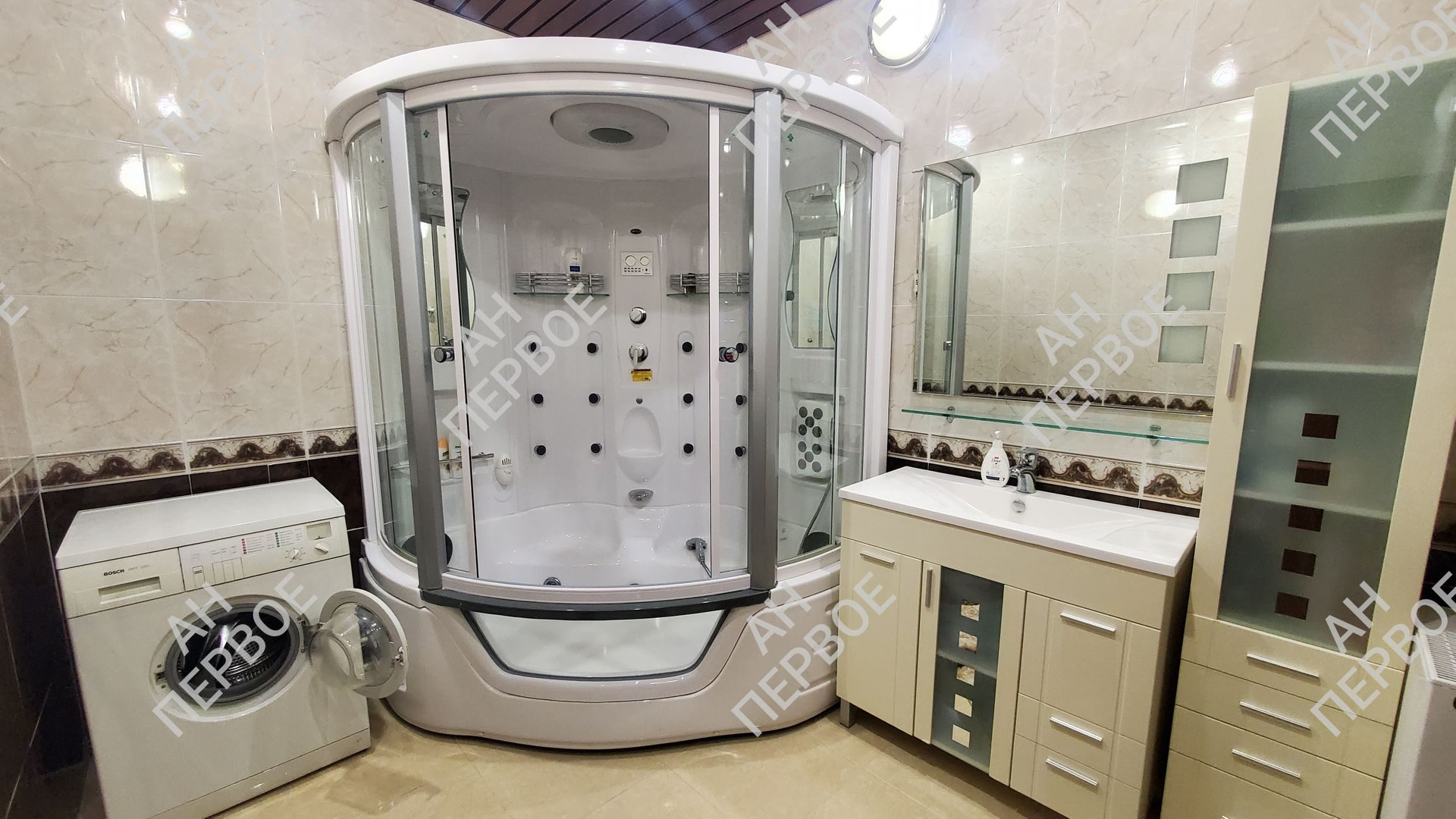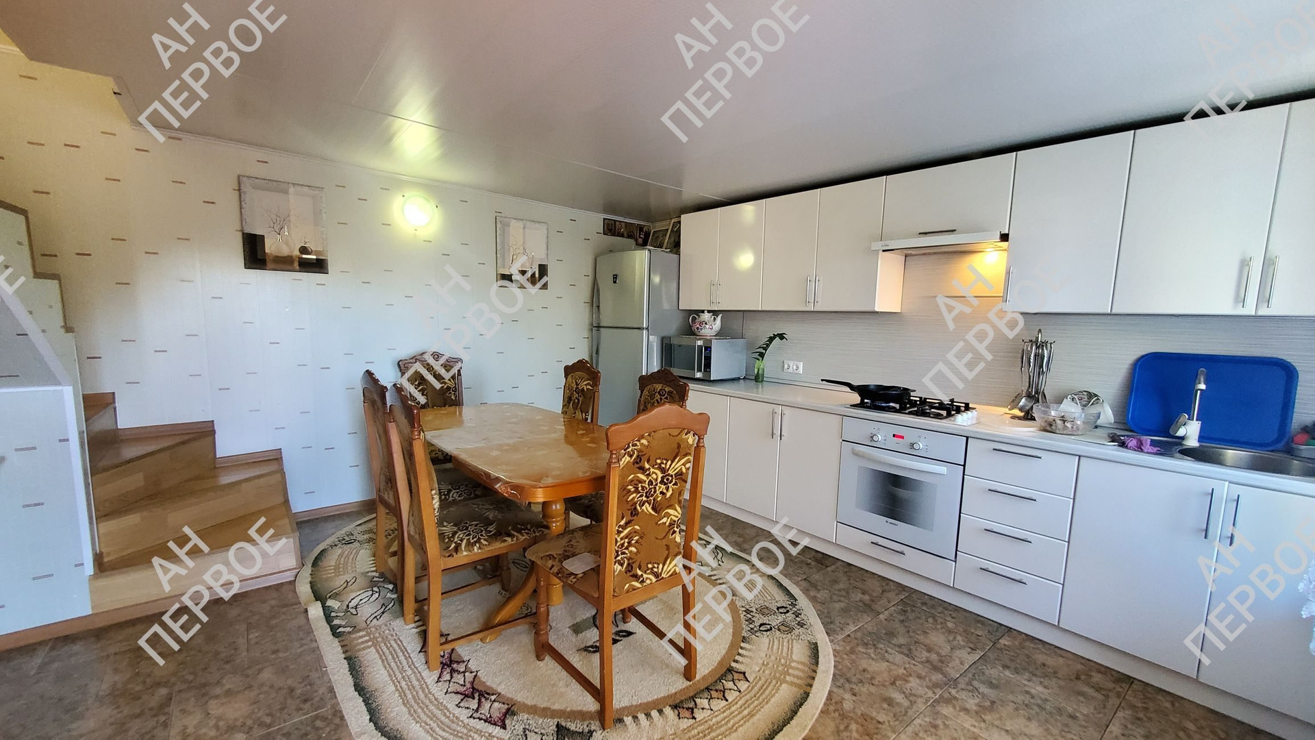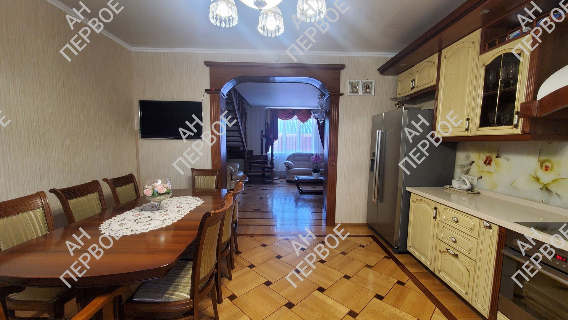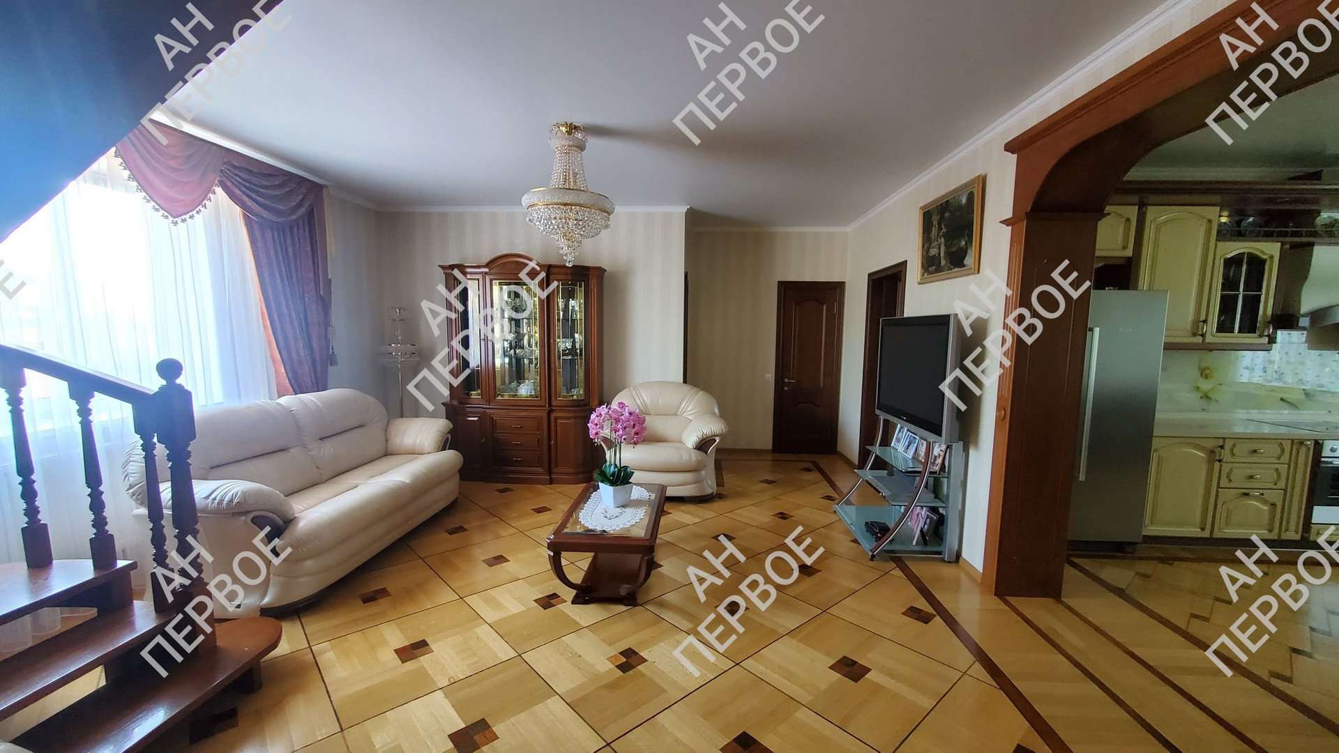 На первом этаже огромная гостиная, шикарная кухня, спальня и санузел.