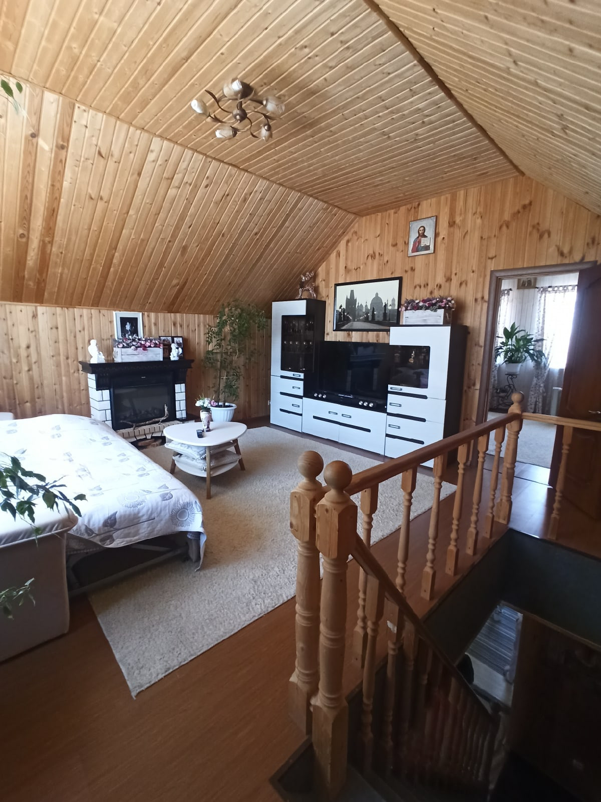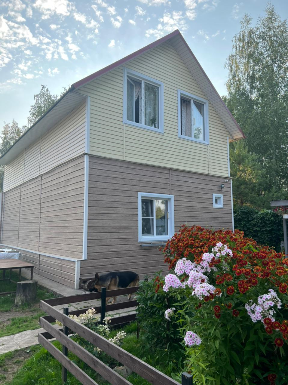 Дом бревенчатый, второй этаж -  каркасник, все обшито сайдингом.  Внутри дом жилой, со всеми коммуникациями,  (канализация, отопление-электрокотел), все в идеальном состоянии.  Отделка экологичными материалами (дерево).