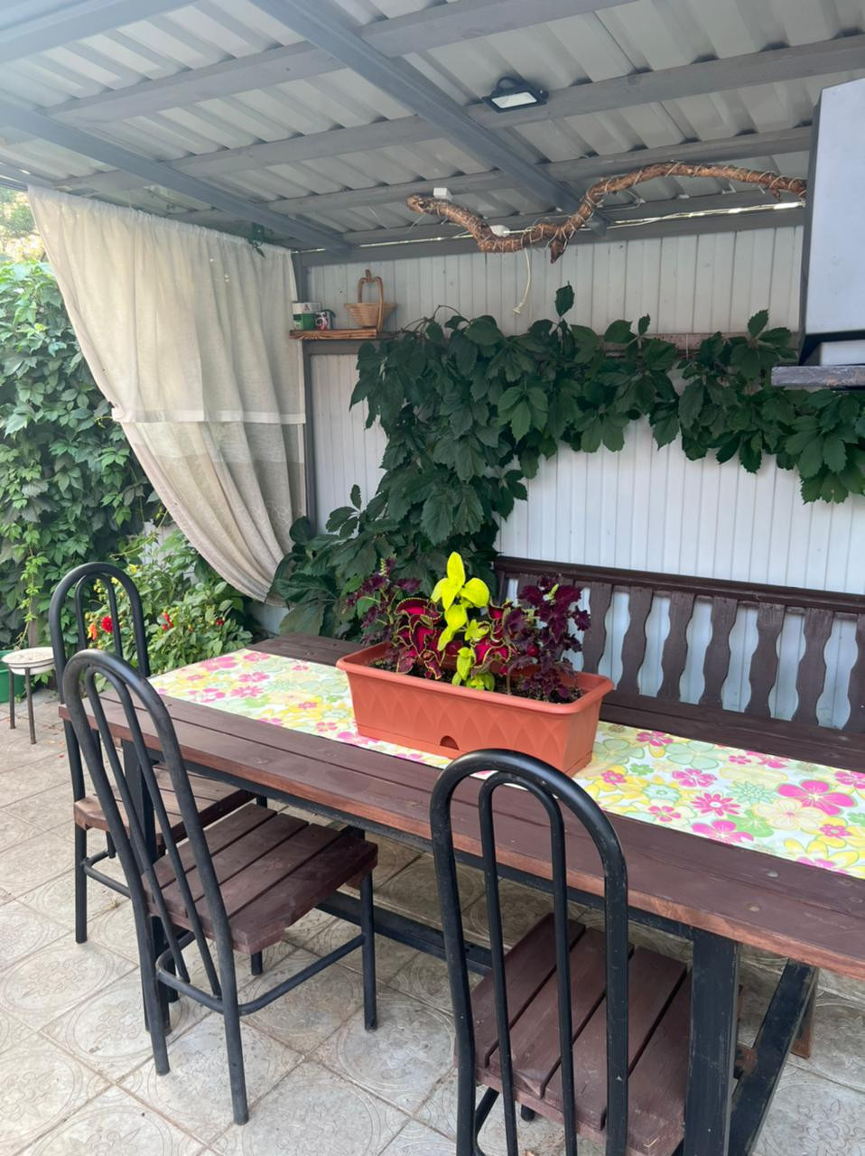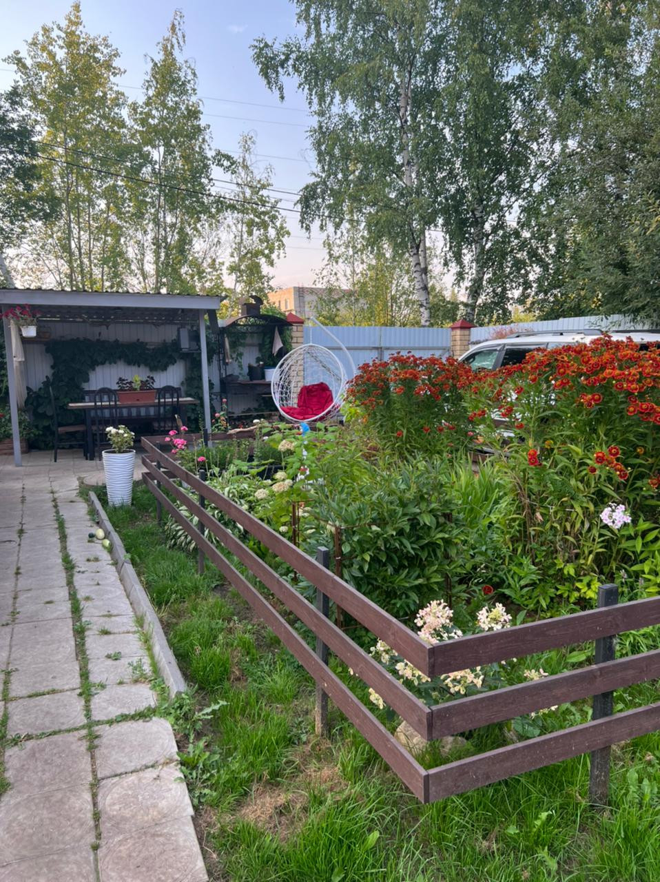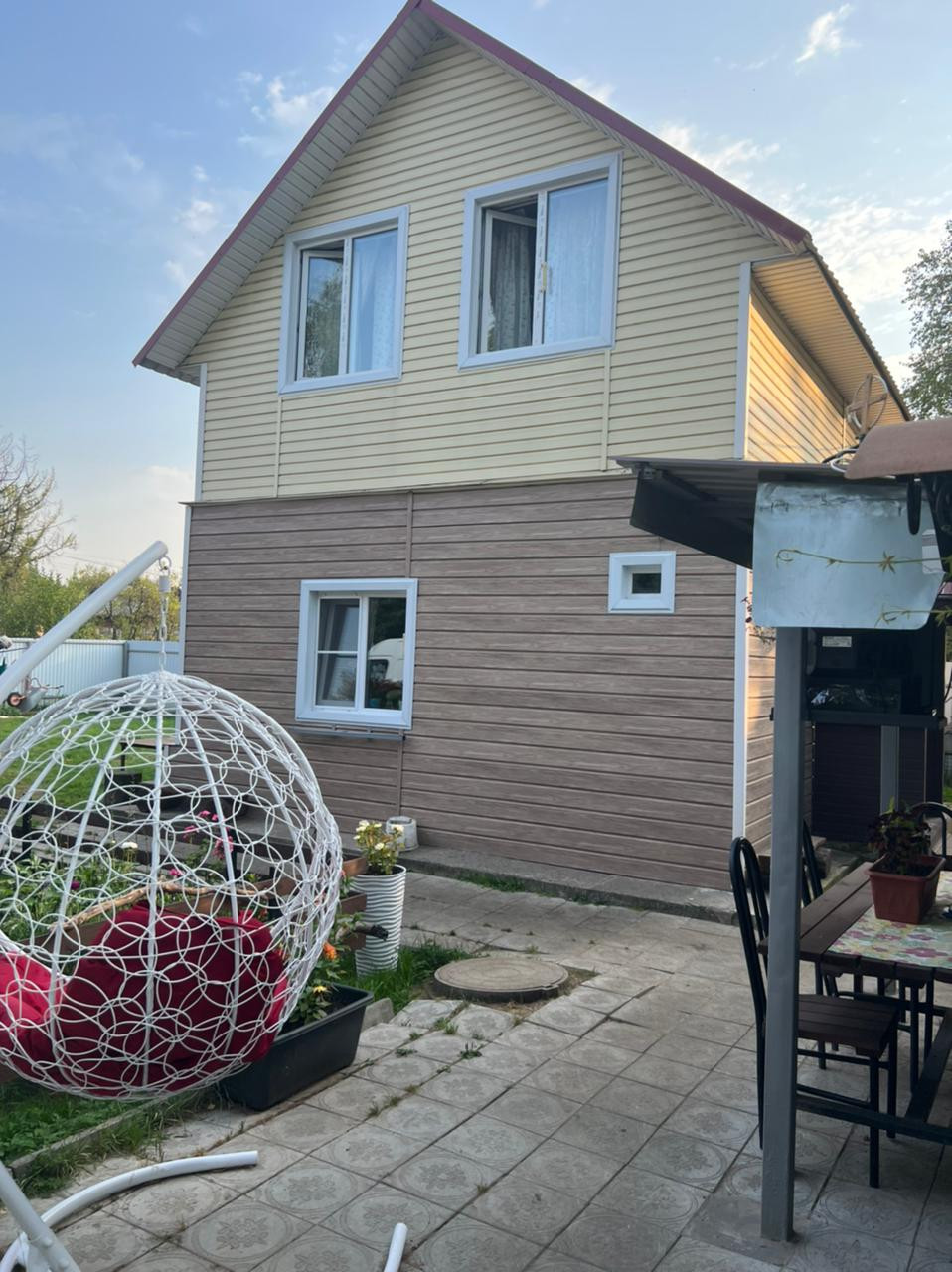 Во дворе дома сделано благоустройство, зона отдыха выложена плиткой, есть навес для посиделок, мангал, стоянка для авто. На территории также имеется  двухэтажная баня 80 кв.м. с комнатой отдыха на втором этаже.