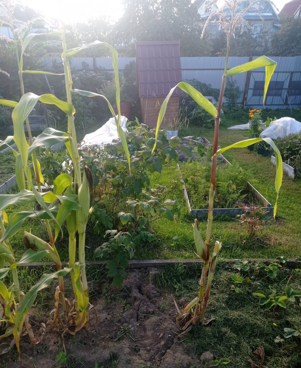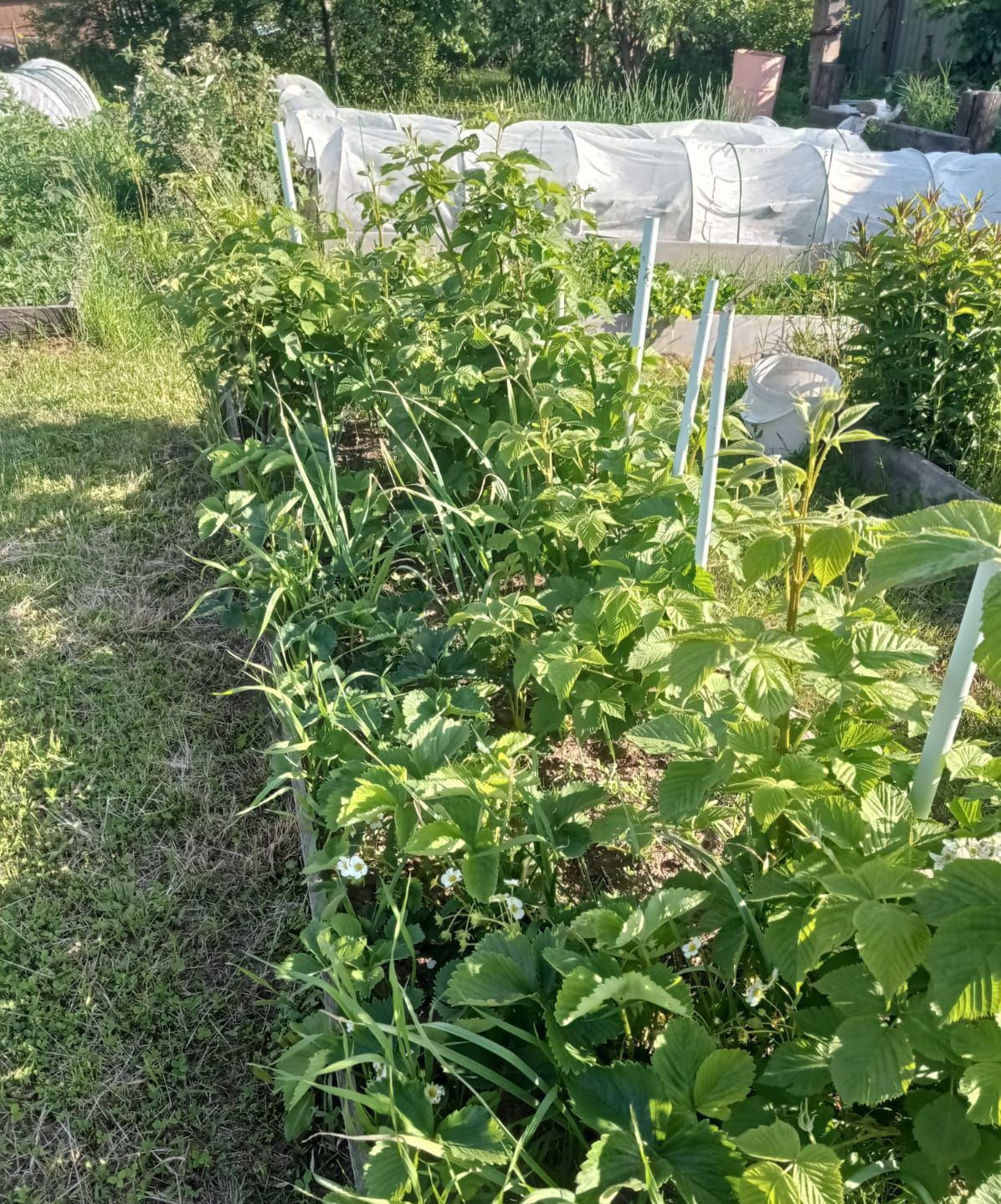 На участке плодово ягодные насаждения (яблони, сливы, малина, смородина, многолетние цветы).