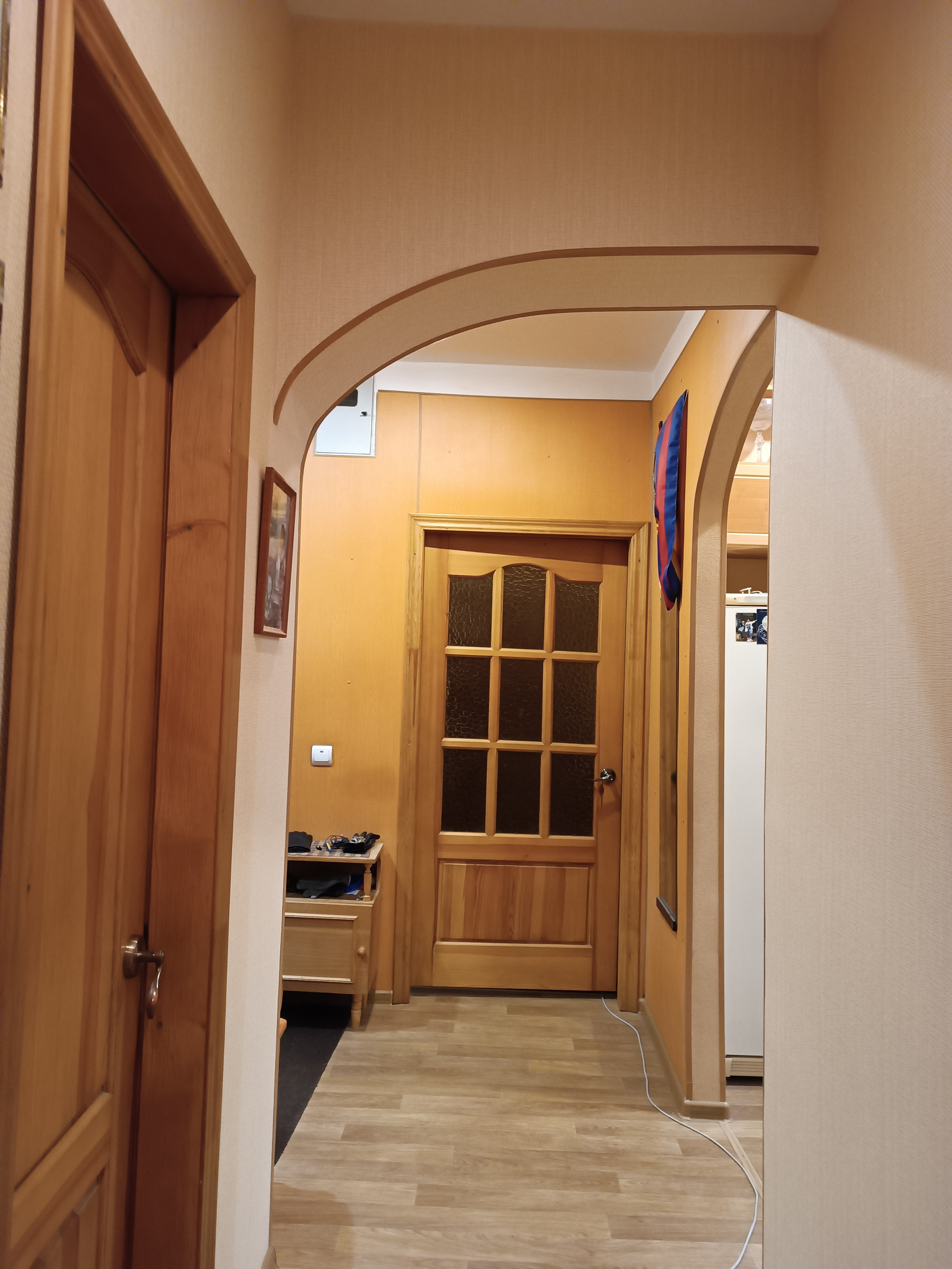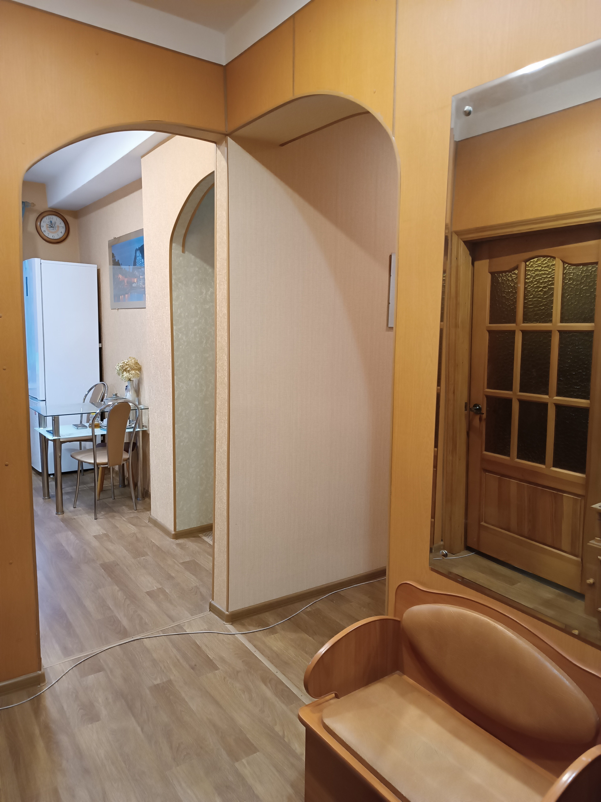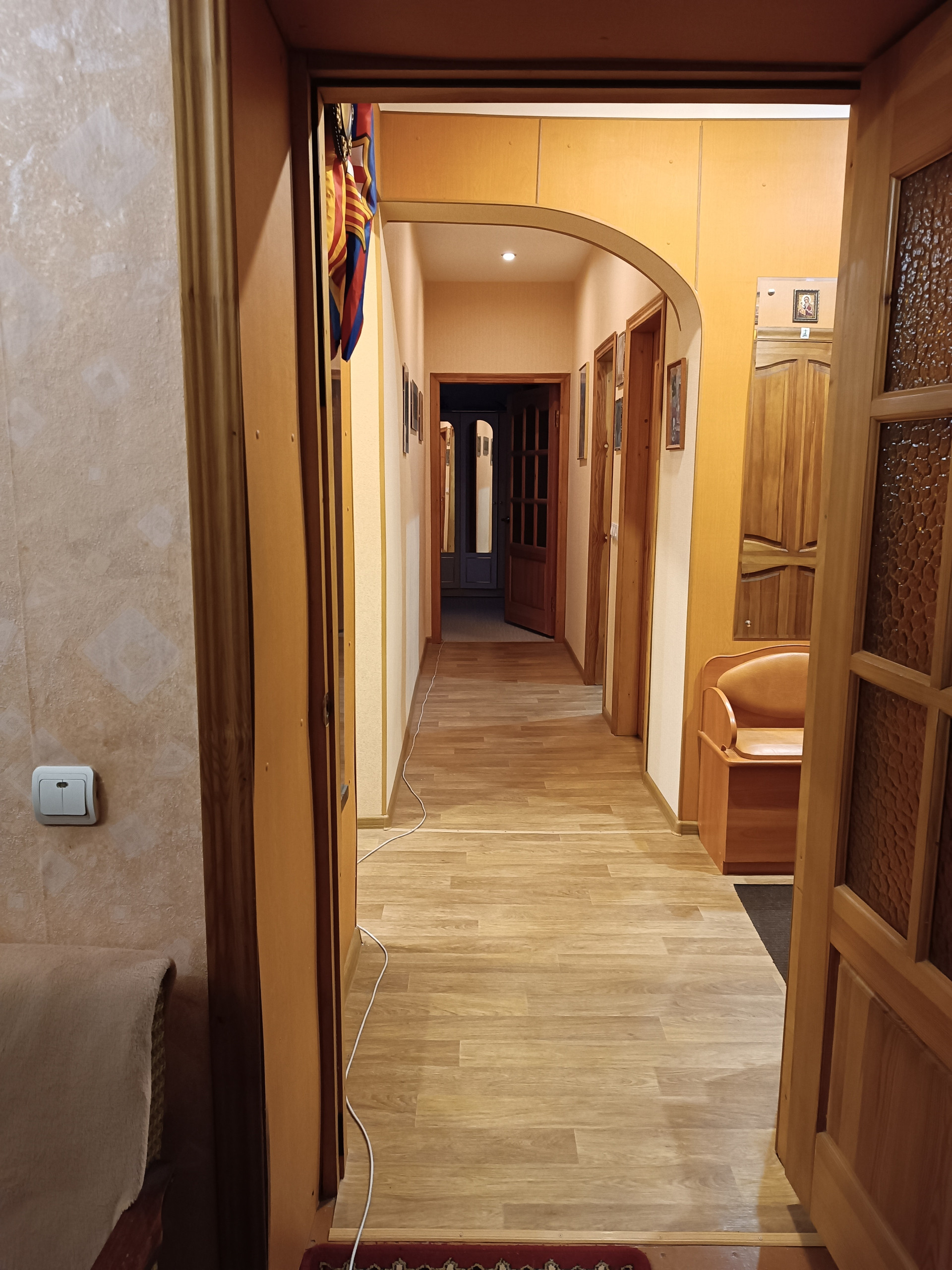 Красивые межкомнатные двери из натурального дерева. Комнаты изолированные в отличном состоянии. Высокие потолки с натяжным и подвесным оформлением. В спальной есть отдельная вместительная гардеробная комната. Большая восьмиметровая кухня, гарнитур остаётся.