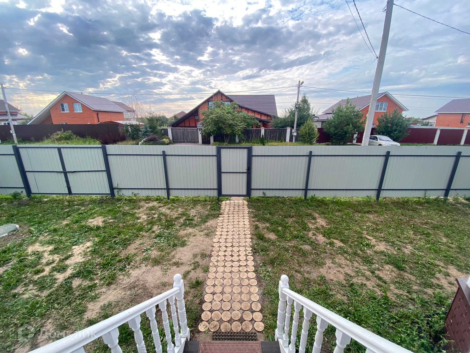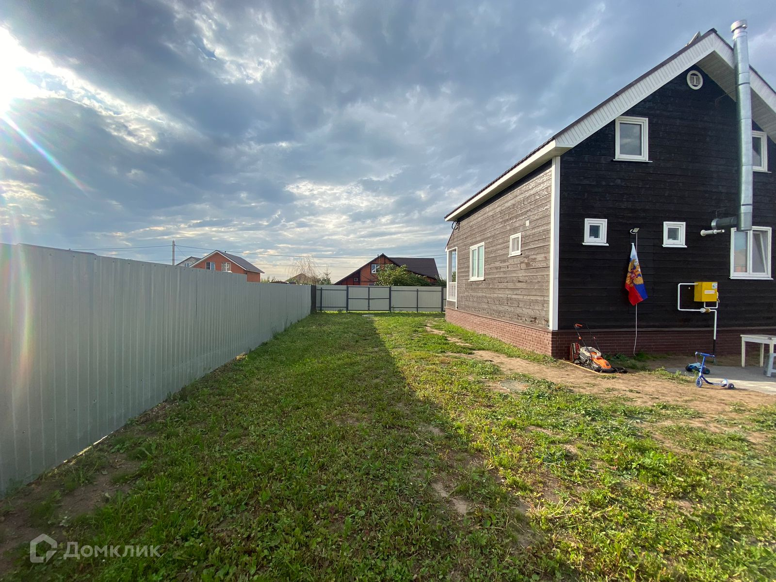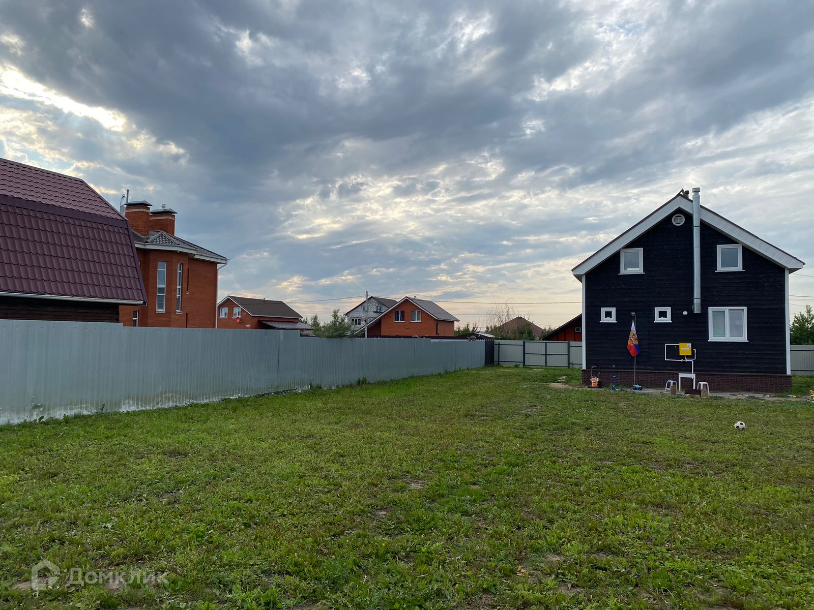По периметру участок огорожен забором из металлического профлиста, есть ворота для въезда автомобиля на участок.