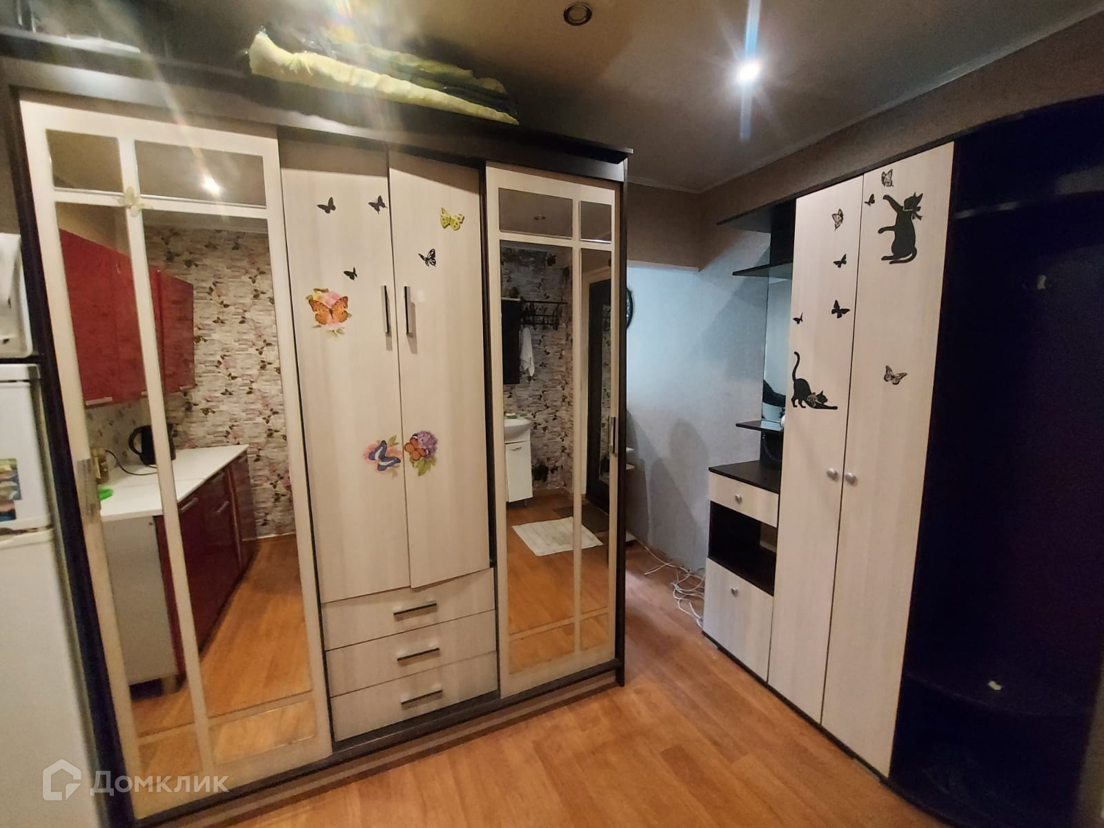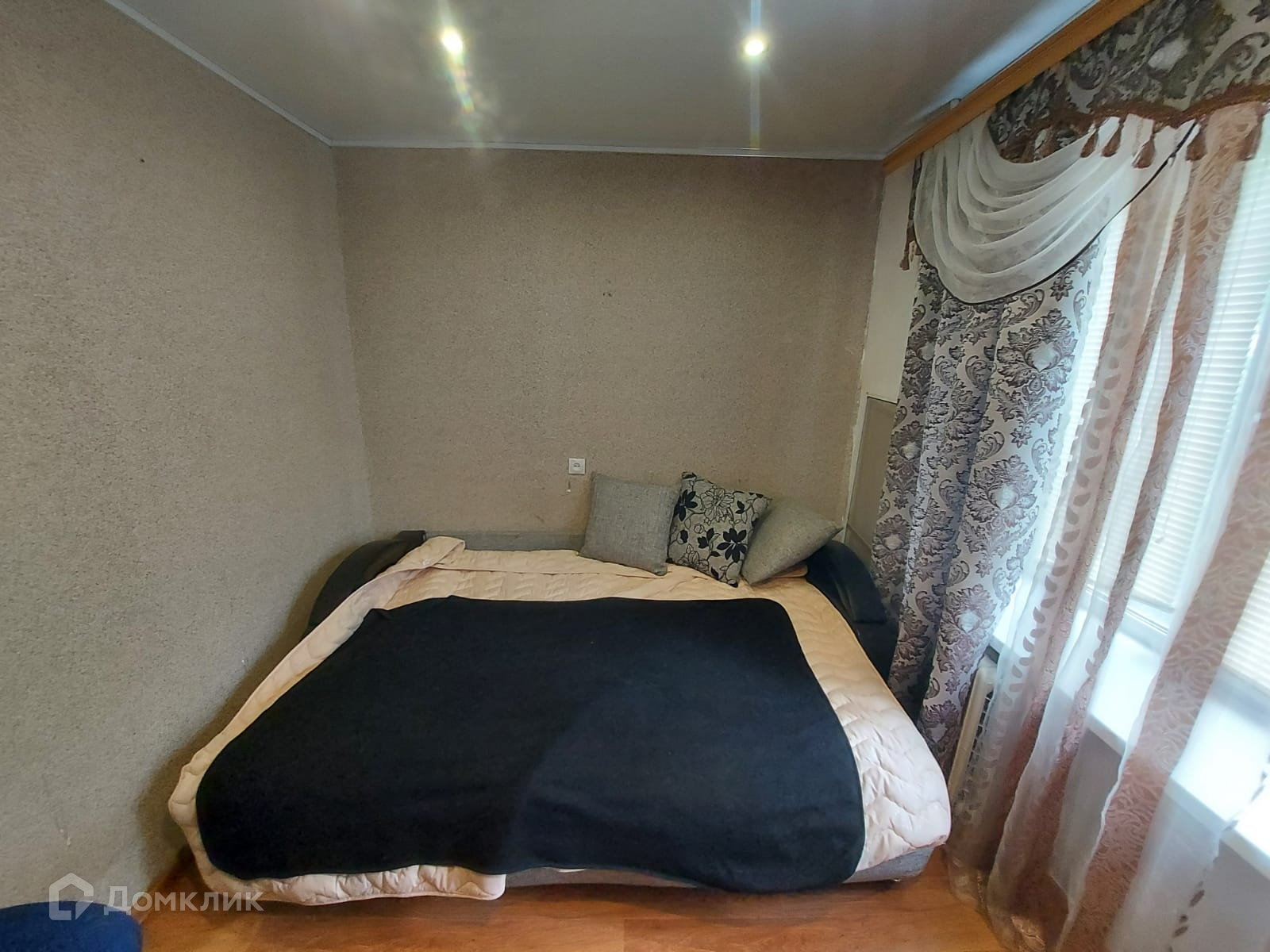 Натяжные потолки, пластиковые окна, две отдельные зоны. Спальное место отделено от небольшой кухни.