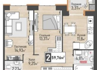 Двухкомнатная квартира на продажу, 59.8 м2