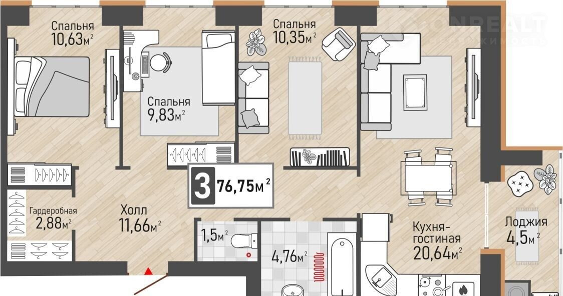 Общая площадь 76.8 м2