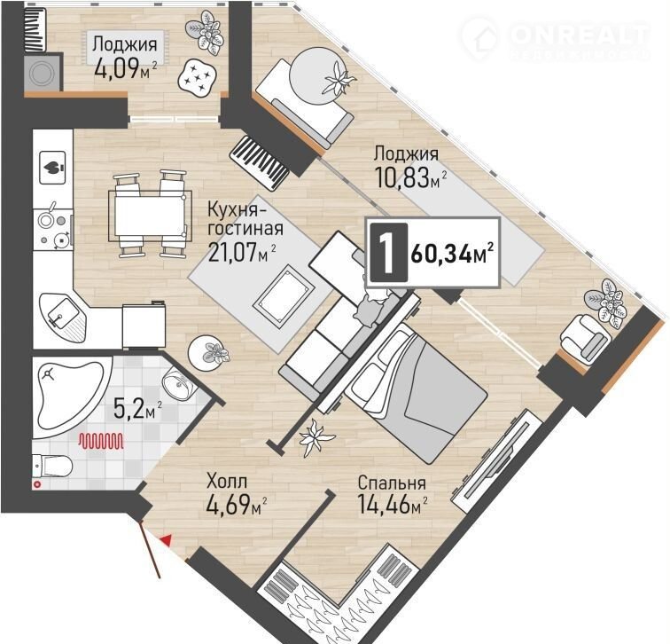 Общая площадь 60.3 м2