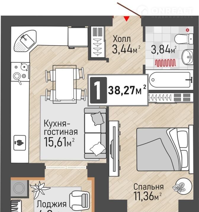 Общая площадь 38.3 м2