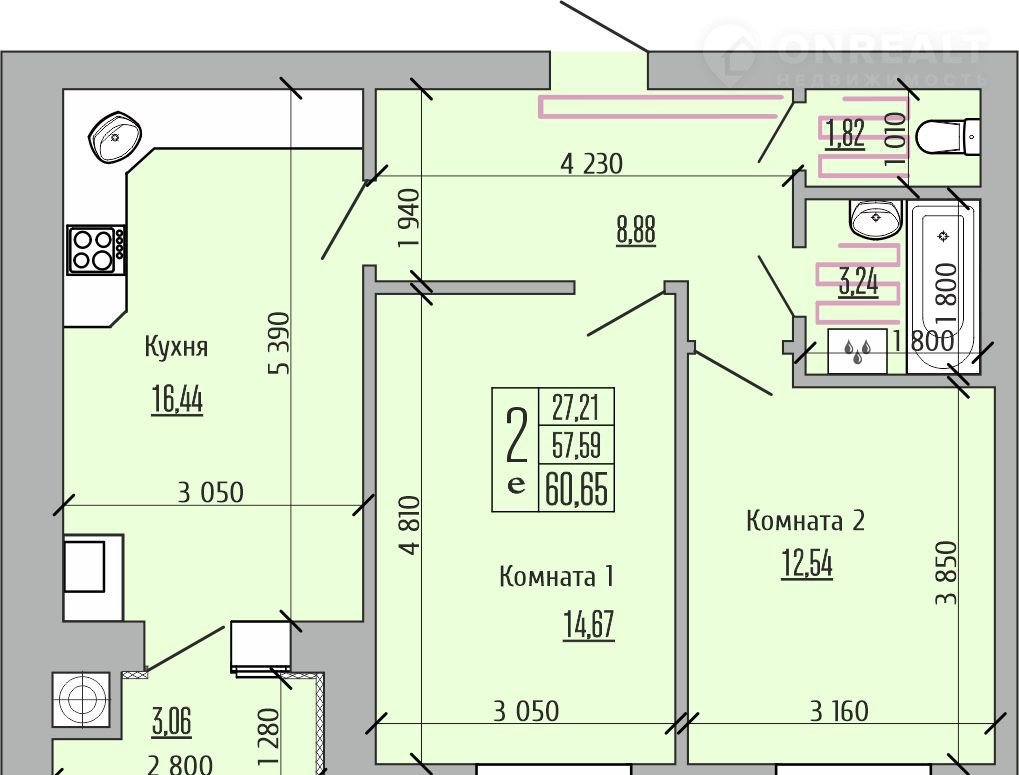 Общая площадь 60.7 м2
