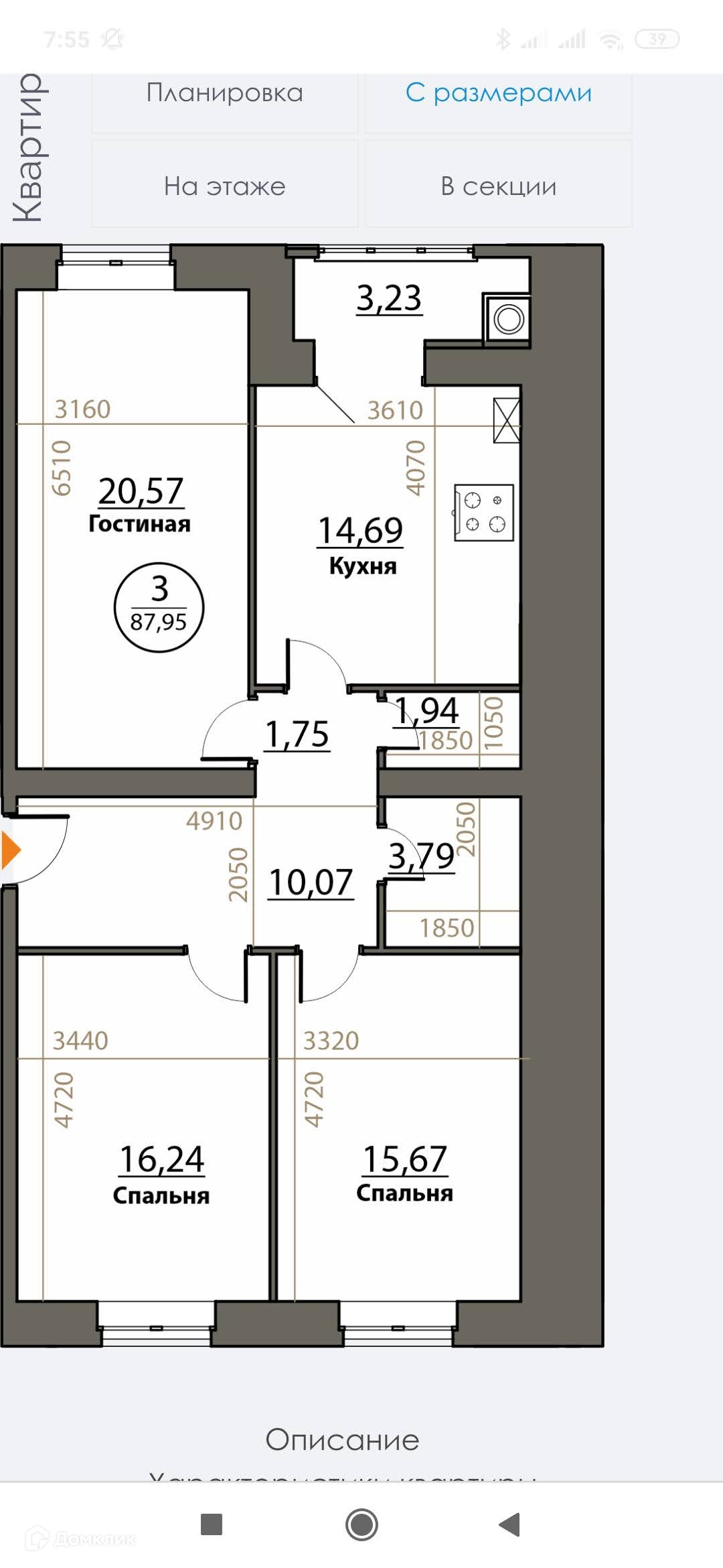 Квартира расположена на 7 этаже, площадь 84,2 кв.м.